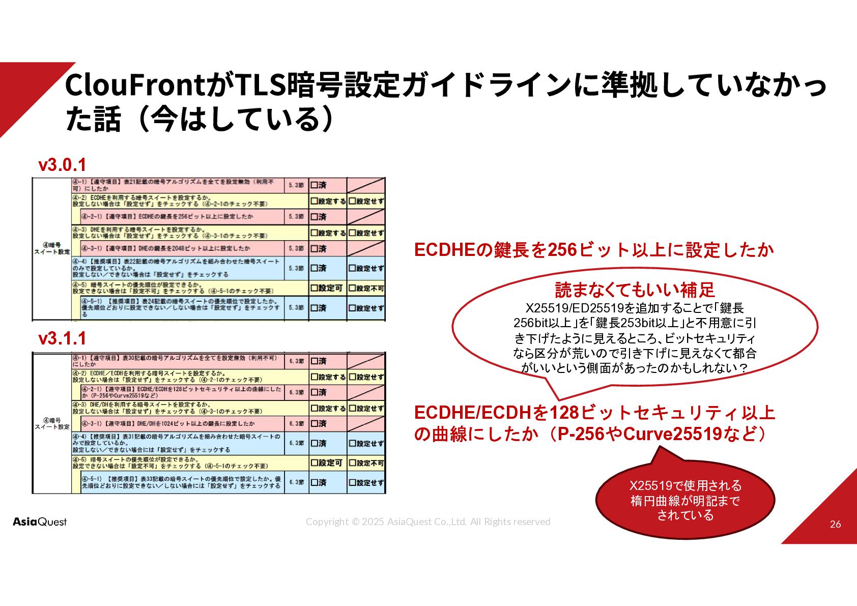 v3.0.1 v3.1.1 ECDHEの鍵長を256ビット以上に設定したか ECDHE/ECDHを128ビットセキュリティ以上 の曲線にしたか(P-256やCurve25519など) X25519で使用される 楕円曲線が明記まで されている 読まなくてもいい補足 X25519/ED25519を追加することで「鍵長 256bit以上」を「鍵長253bit以上」と不用意に引 き下げたように見えるところ、ビットセキュリティ なら区分が荒いので引き下げに見えなくて都合 がいいという側面があったのかもしれない?