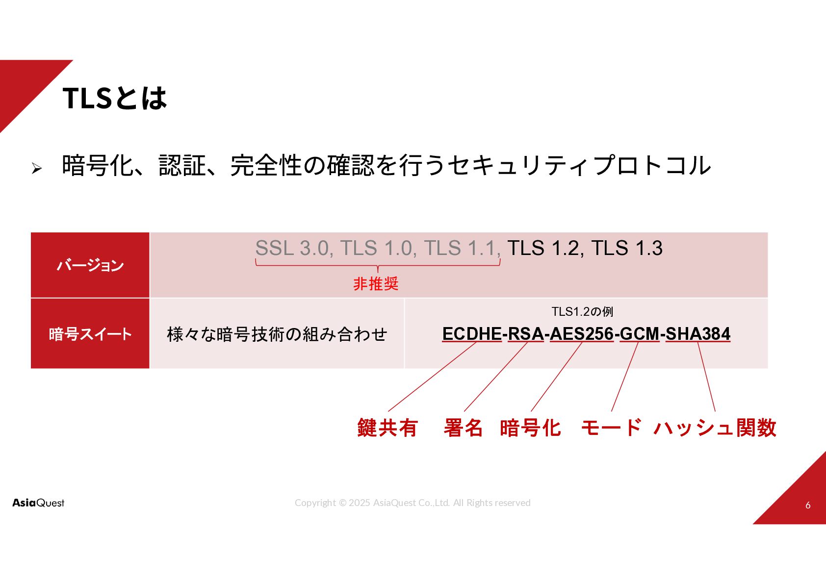SSL 3.0, TLS 1.0, TLS 1.1, TLS 1.2, TLS 1.3 バージョン ECDHE-RSA-AES256-GCM-SHA384 様々な暗号技術の組み合わせ 暗号スイート 非推奨 鍵共有 署名 暗号化 モード ハッシュ関数 TLS1.2の例