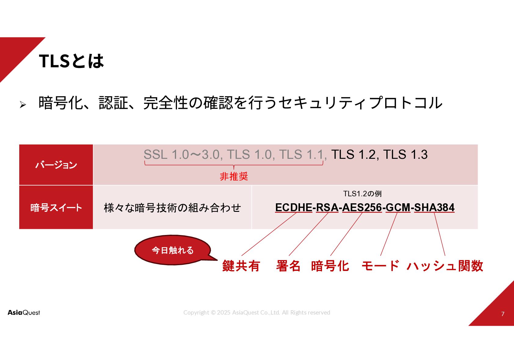 SSL 1.0~3.0, TLS 1.0, TLS 1.1, TLS 1.2, TLS 1.3 バージョン ECDHE-RSA-AES256-GCM-SHA384 様々な暗号技術の組み合わせ 暗号スイート 非推奨 鍵共有 署名 暗号化 モード ハッシュ関数 TLS1.2の例 今日触れる