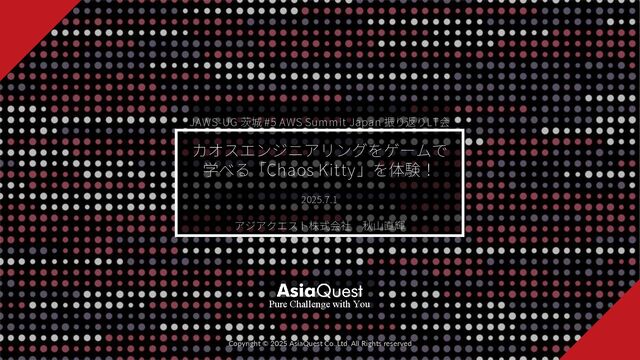 © 2025 AsiaQuest Co.,Ltd. All Rights reserved Pure Challenge with You 2025.7.1 JAWS-UG 茨城 #5 AWS Summit Japan 振り返りLT会 カオスエンジニアリングをゲームで学べる 「Chaos Kitty」を体験!