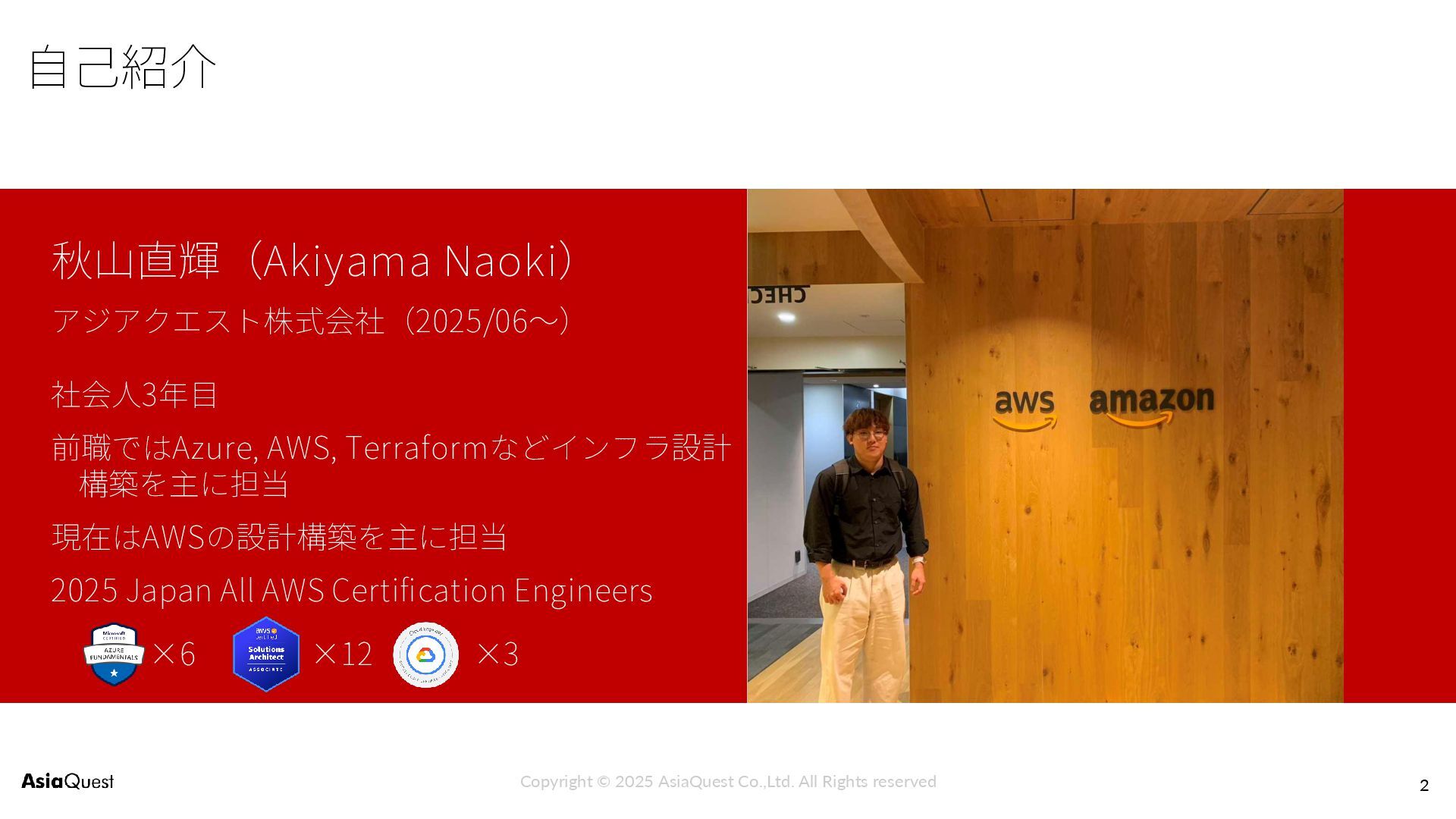 Naoki) アジアクエスト株式会社(2025/06~) 社会人3年目 前職ではAzure, AWS, Terraformなどインフラ設計 構築を主に担当 現在はAWSの設計構築を主に担当 2025 Japan All AWS Certification Engineers 自己紹介 ×6 ×12 ×3