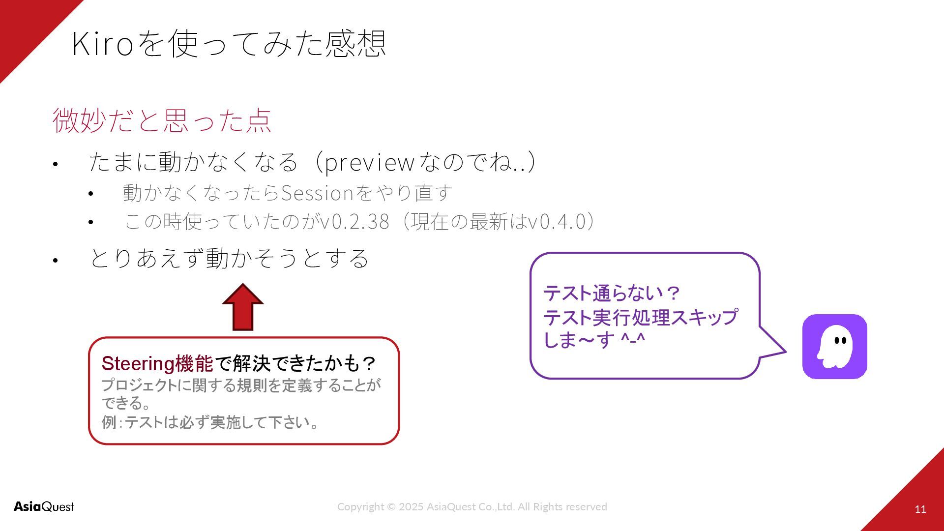 Kiroを使ってみた感想 微妙だと思った点 • たまに動かなくなる(previewなのでね..) • 動かなくなったらSessionをやり直す • この時使っていたのがv0.2.38(現在の最新はv0.4.0) • とりあえず動かそうとする テスト通らない? テスト実行処理スキップ しま~す ^-^ Steering機能で解決できたかも? プロジェクトに関する規則を定義することが できる。 例:テストは必ず実施して下さい。