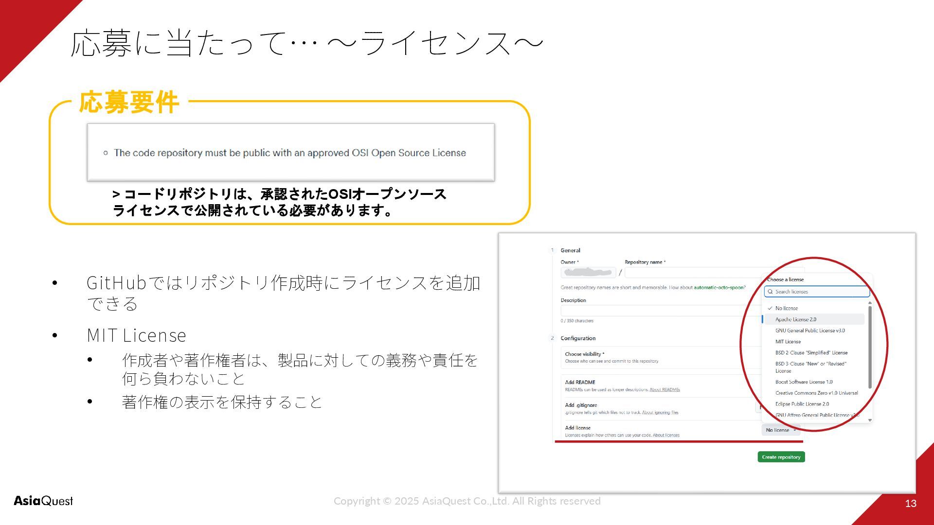 応募に当たって… ~ライセンス~ • GitHubではリポジトリ作成時にライセンスを追加 できる • MIT License • 作成者や著作権者は、製品に対しての義務や責任を 何ら負わないこと • 著作権の表示を保持すること > コードリポジトリは、承認されたOSIオープンソース ライセンスで公開されている必要があります。 応募要件