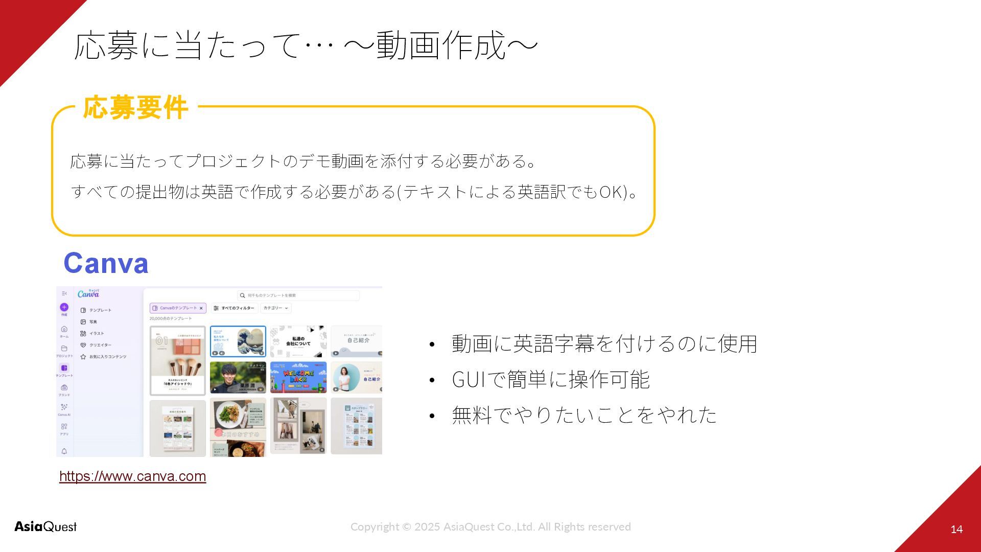 応募に当たって… ~動画作成~ 応募に当たってプロジェクトのデモ動画を添付する必要がある。 すべての提出物は英語で作成する必要がある(テキストによる英語訳でもOK)。 Canva https://www.canva.com • 動画に英語字幕を付けるのに使用 • GUIで簡単に操作可能 • 無料でやりたいことをやれた 応募要件