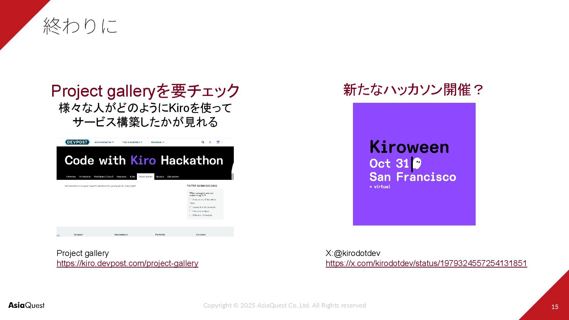 終わりに Project galleryを要チェック 様々な人がどのようにKiroを使って サービス構築したかが見れる Project gallery https://kiro.devpost.com/project-gallery 新たなハッカソン開催? X:@kirodotdev https://x.com/kirodotdev/status/1979324557254131851