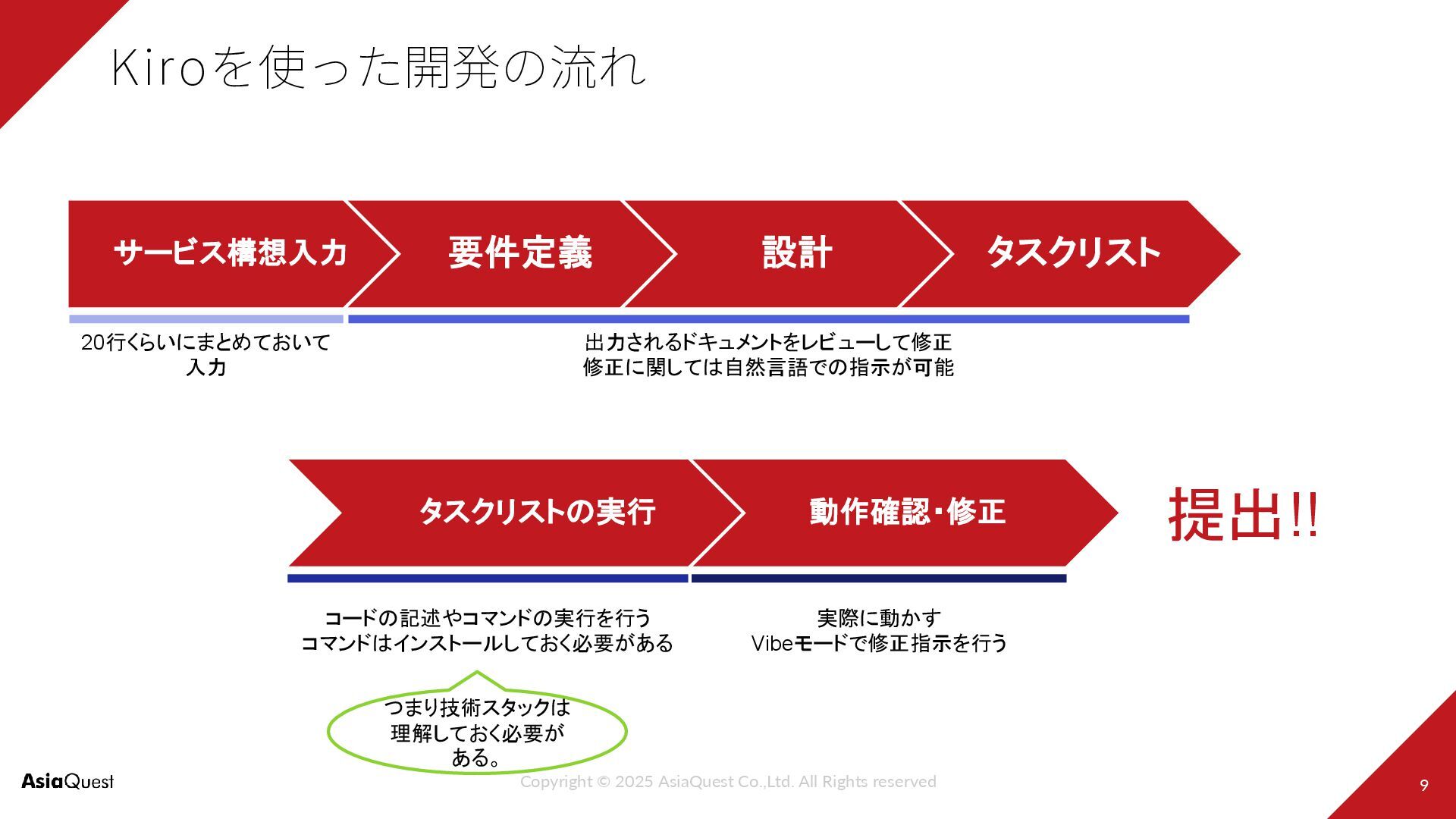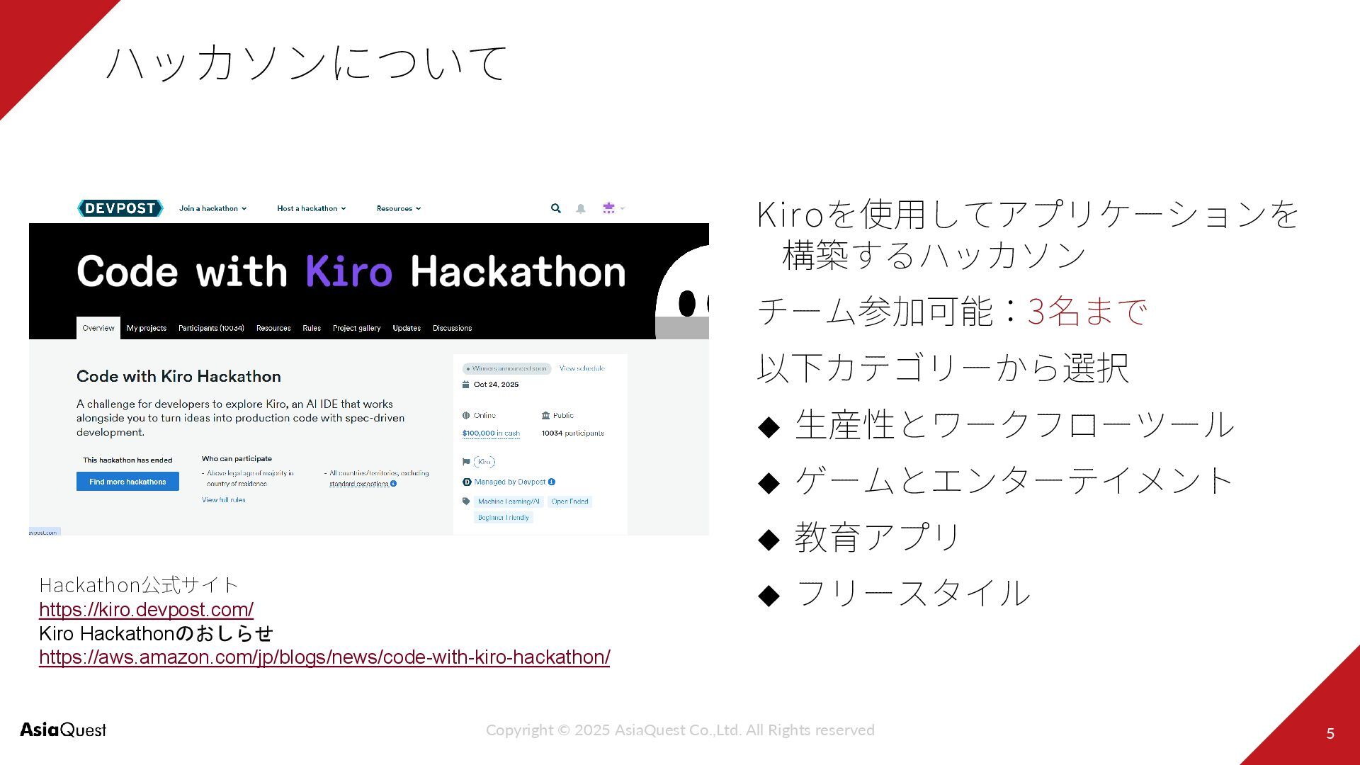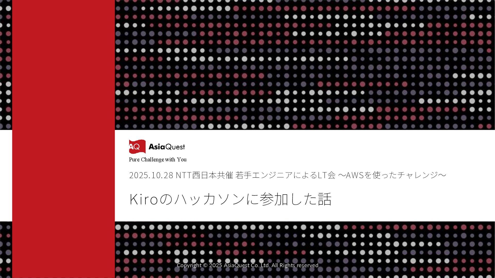 © 2025 AsiaQuest Co.,Ltd. All Rights reserved Pure Challenge with You 2025.10.28 NTT西日本共催 若手エンジニアによるLT会 ~AWSを使ったチャレンジ~ Kiroのハッカソンに参加した話