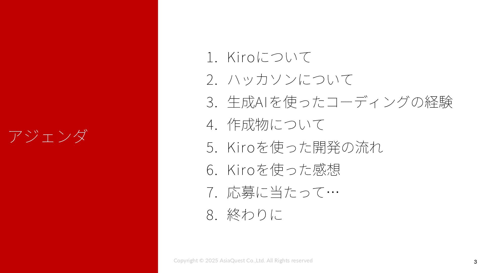 Challenge with You Copyright © 2025 AsiaQuest Co.,Ltd. All Rights reserved NTT西日本共催 若手エンジニアによるLT会 ~AWSのAIサービスを使ったチャレンジ~ Kiroのハッカソンに参加した話 2025.10.28 アジアクエスト株式会社 秋山直輝
