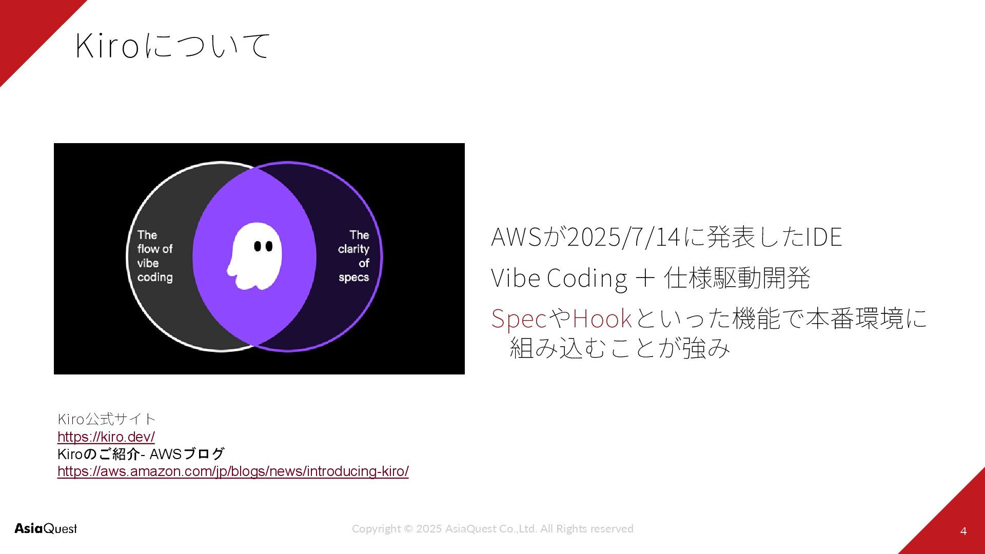 Kiroについて AWSが2025/7/14に発表したIDE Vibe Coding + 仕様駆動開発 SpecやHookといった機能で本番環境に 組み込むことが強み Kiro公式サイト https://kiro.dev/ Kiroのご紹介- AWSブログ https://aws.amazon.com/jp/blogs/news/introducing-kiro/