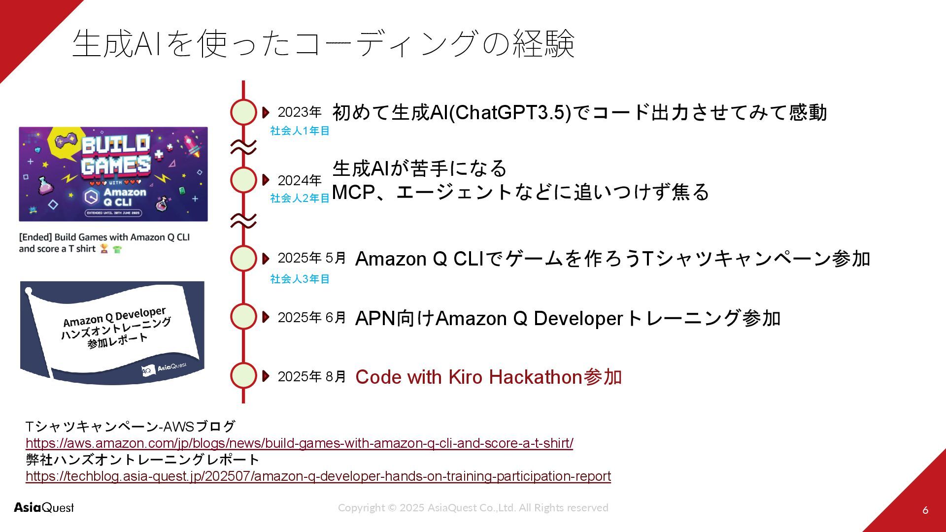 生成AIを使ったコーディングの経験 2023年 Tシャツキャンペーン-AWSブログ https://aws.amazon.com/jp/blogs/news/build-games-with-amazon-q-cli-and-score-a-t-shirt/ 弊社ハンズオントレーニングレポート https://techblog.asia-quest.jp/202507/amazon-q-developer-hands-on-training-participation-report 初めて生成AI(ChatGPT3.5)でコード出力させてみて感動 2024年 2025年 5月 生成AIが苦手になる MCP、エージェントなどに追いつけず焦る Amazon Q CLIでゲームを作ろうTシャツキャンペーン参加 2025年 6月 APN向けAmazon Q Developerトレーニング参加 2025年 8月 Code with Kiro Hackathon参加 社会人1年目 社会人2年目 社会人3年目