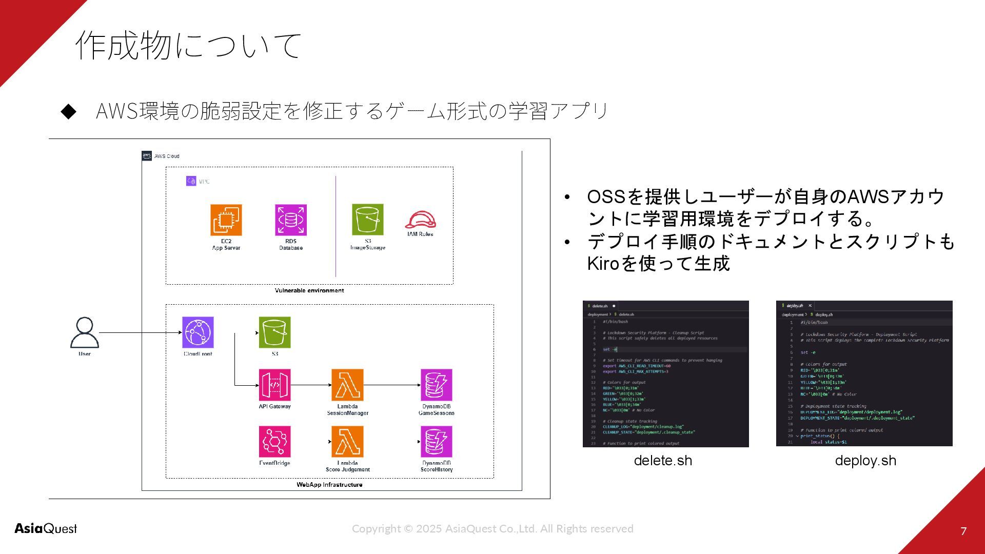 ◆ AWS環境の脆弱設定を修正するゲーム形式の学習アプリ 作成物について • OSSを提供しユーザーが自身のAWSアカウ ントに学習用環境をデプロイする。 • デプロイ手順のドキュメントとスクリプトも Kiroを使って生成 delete.sh deploy.sh