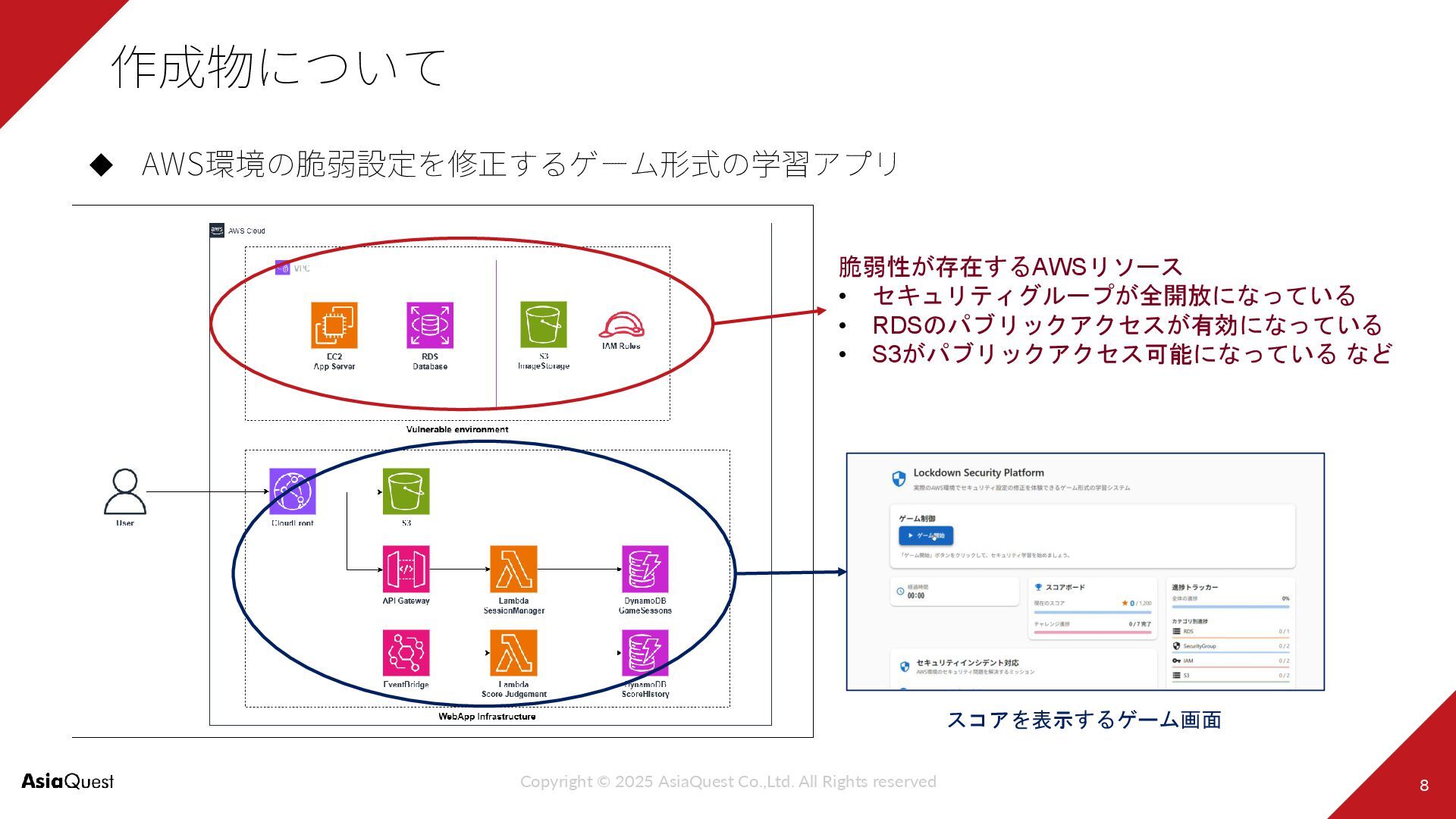 ◆ AWS環境の脆弱設定を修正するゲーム形式の学習アプリ 作成物について 脆弱性が存在するAWSリソース • セキュリティグループが全開放になっている • RDSのパブリックアクセスが有効になっている • S3がパブリックアクセス可能になっている など スコアを表示するゲーム画面