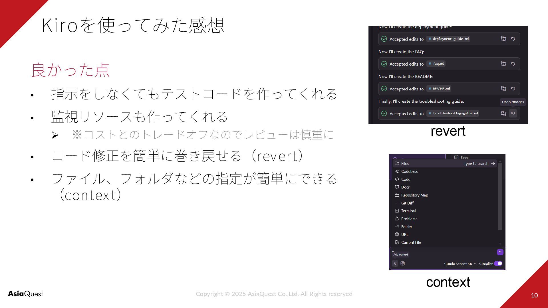 Kiroを使ってみた感想 良かった点 • 指示をしなくてもテストコードを作ってくれる • 監視リソースも作ってくれる ➢ ※コストとのトレードオフなのでレビューは慎重に • コード修正を簡単に巻き戻せる(revert) • ファイル、フォルダなどの指定が簡単にできる (context) revert context