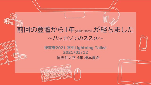 前回の登壇から1年 (正確には8か月) が経ちました ~ハッカソンのススメ~ 技育祭2021 学生Lightning Talks! 2021/03/12 同志社大学 4年