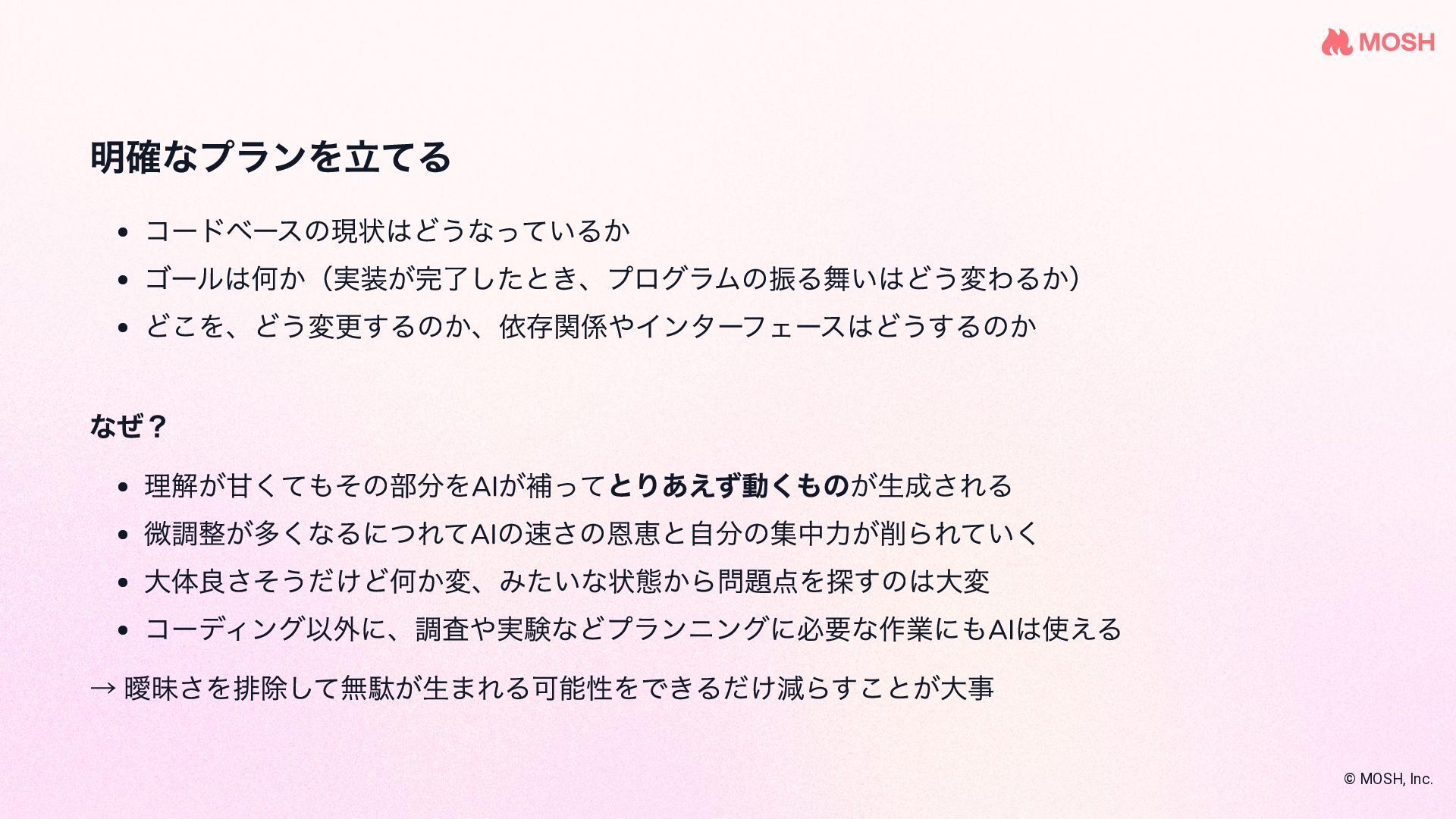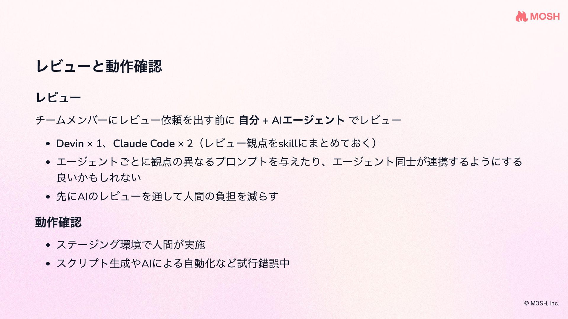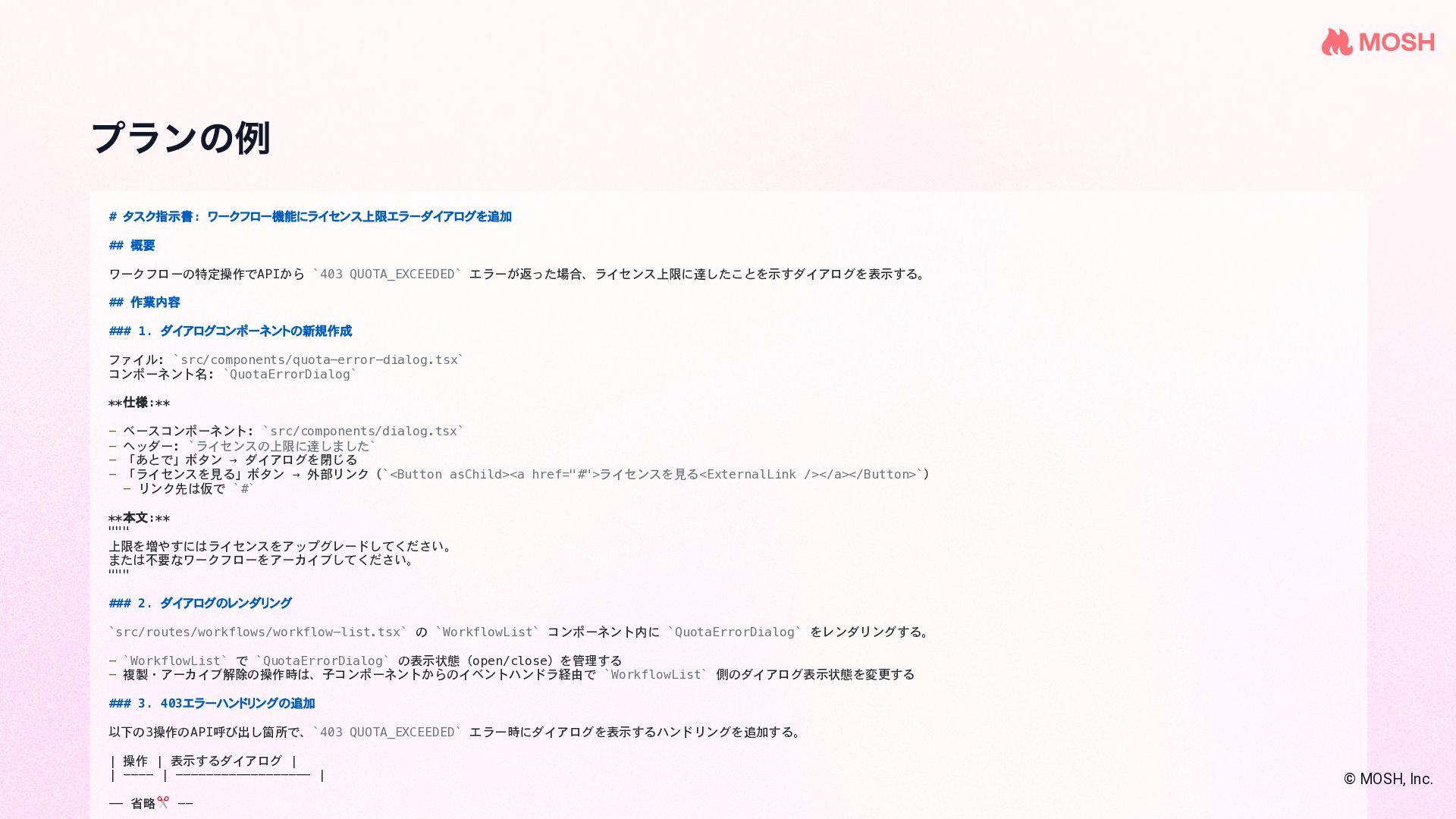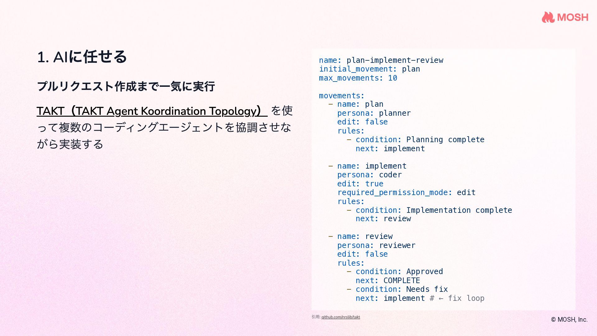 を使 って複数のコーディングエージェントを協調させな がら実装する name: plan-implement-review initial_movement: plan max_movements: 10 movements: - name: plan persona: planner edit: false rules: - condition: Planning complete next: implement - name: implement persona: coder edit: true required_permission_mode: edit rules: - condition: Implementation complete next: review - name: review persona: reviewer edit: false rules: - condition: Approved next: COMPLETE - condition: Needs fix next: implement # ← fix loop © MOSH, Inc. 引用: github.com/nrslib/takt