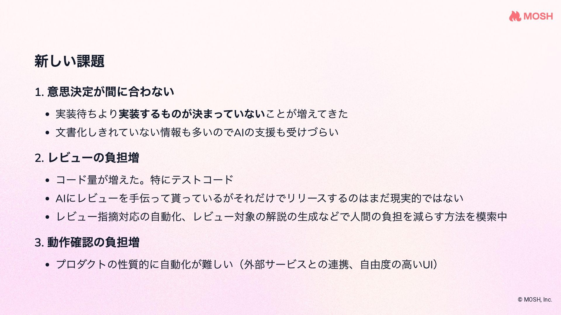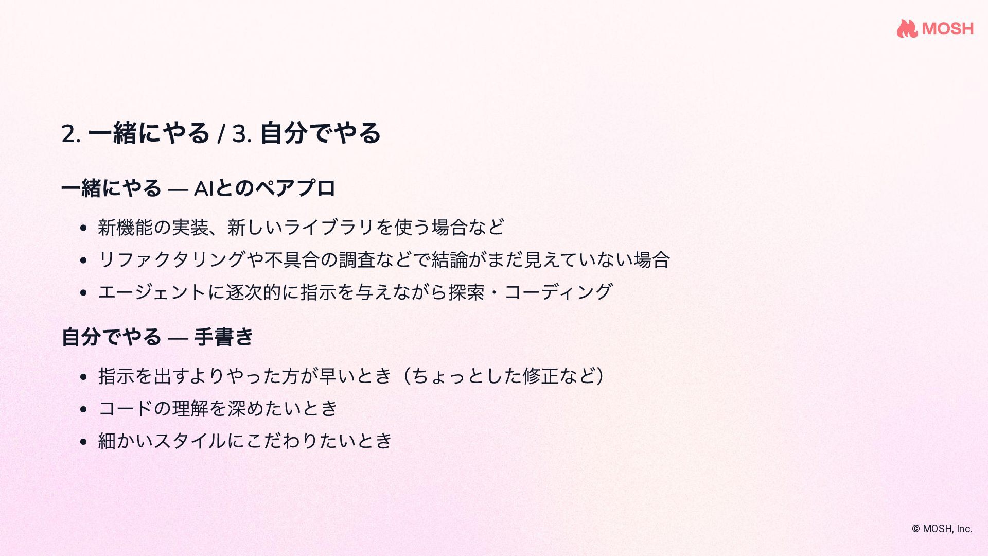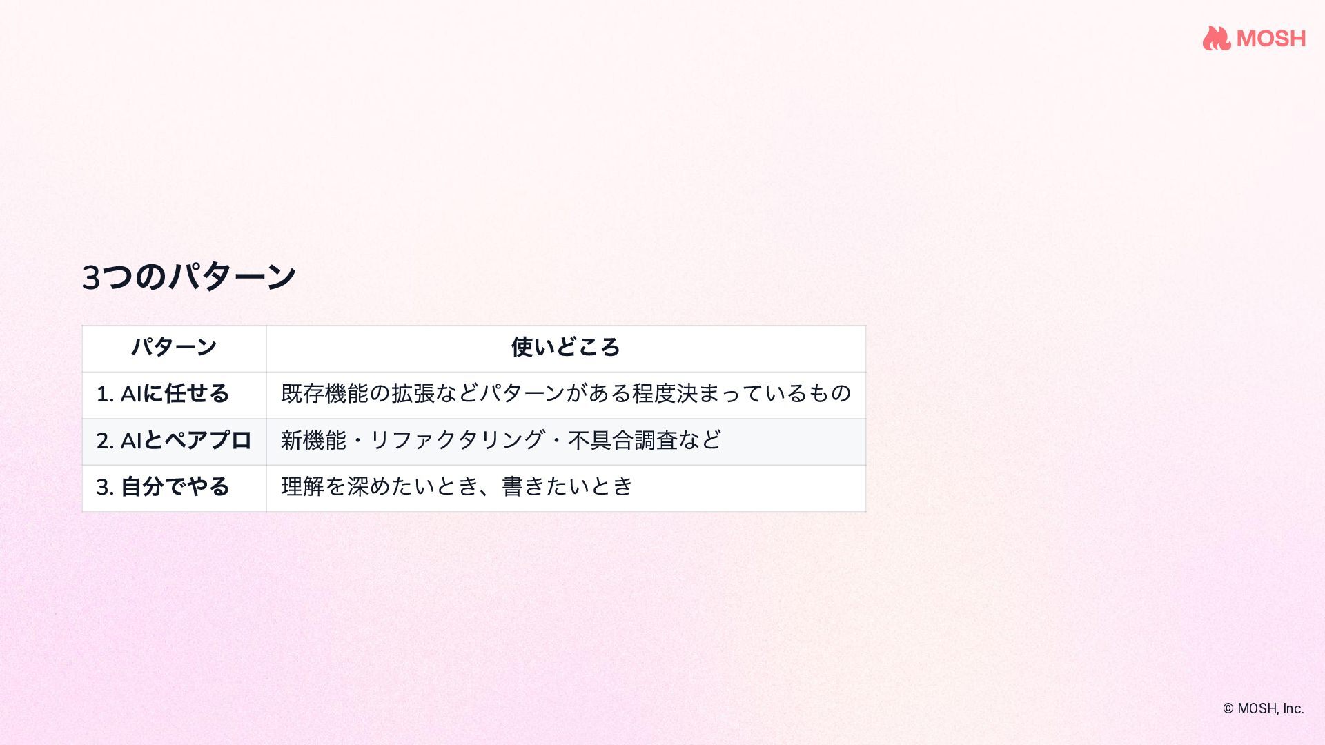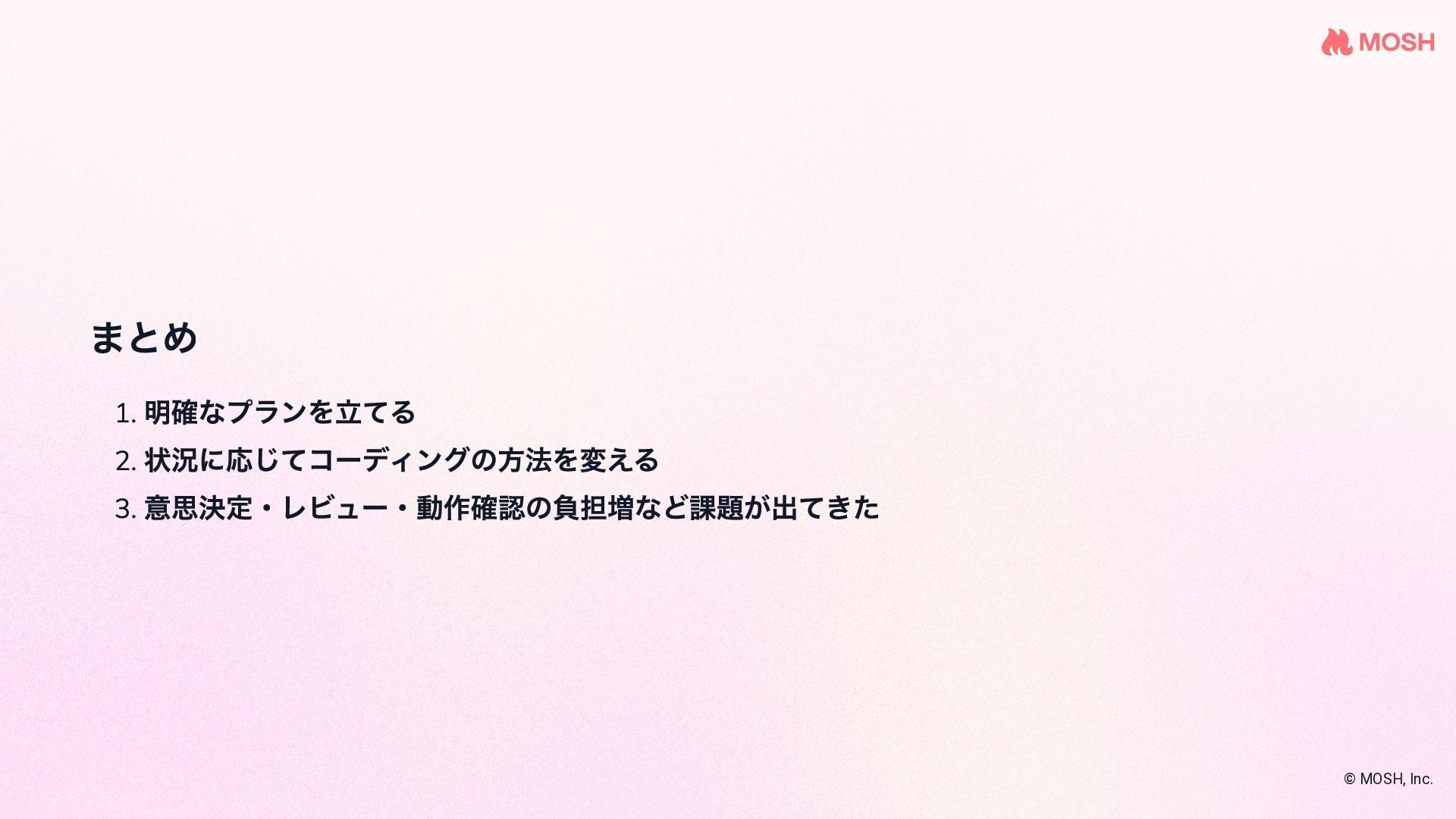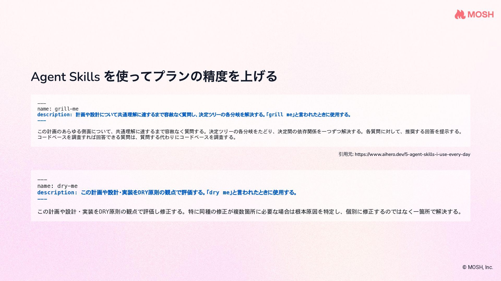 を使 って複数のコーディングエージェントを協調させな がら実装する name: plan-implement-review initial_movement: plan max_movements: 10 movements: - name: plan persona: planner edit: false rules: - condition: Planning complete next: implement - name: implement persona: coder edit: true required_permission_mode: edit rules: - condition: Implementation complete next: review - name: review persona: reviewer edit: false rules: - condition: Approved next: COMPLETE - condition: Needs fix next: implement # ← fix loop © MOSH, Inc. 引用: github.com/nrslib/takt