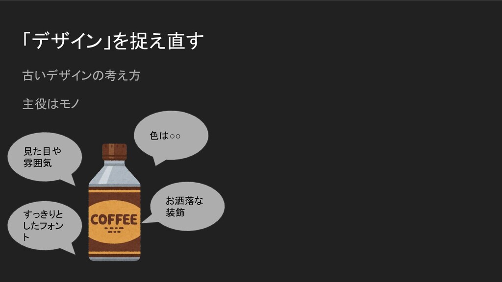 「デザイン」を捉え直す 古いデザインの考え方 主役はモノ 色は◦◦ お洒落な 装飾 すっきりと したフォン ト 見た目や