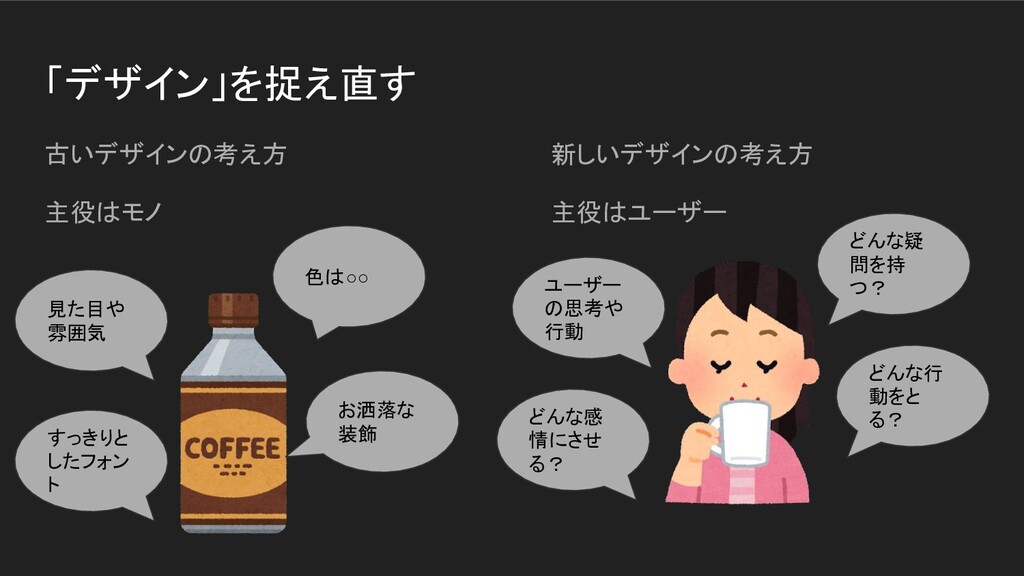「デザイン」を捉え直す 古いデザインの考え方 主役はモノ 新しいデザインの考え方 色は◦◦ お洒落な 装飾 すっきりと したフォン ト