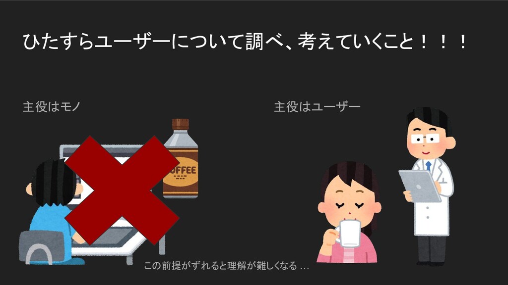 ひたすらユーザーについて調べ、考えていくこと!!! 主役はモノ 主役はユーザー この前提がずれると理解が難しくなる …