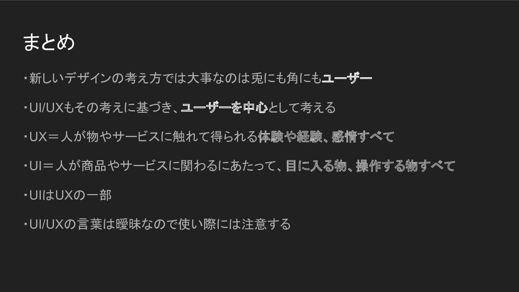 まとめ ・新しいデザインの考え方では大事なのは兎にも角にもユーザー ・UI/UXもその考えに基づき、ユーザーを中心として考える ・UX=人が物やサービスに触れて得られる体験や経験、感情すべて ・UI=人が商品やサービスに関わるにあたって、目に入る物、操作する物すべて ・UIはUXの一部 ・UI/UXの言葉は曖昧なので使い際には注意する