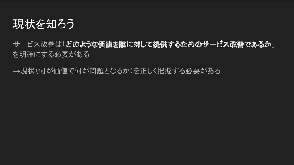 現状を知ろう サービス改善は「どのような価値を誰に対して提供するためのサービス改善であるか」 を明確にする必要がある →現状(何が価値で何が問題となるか)を正しく把握する必要がある