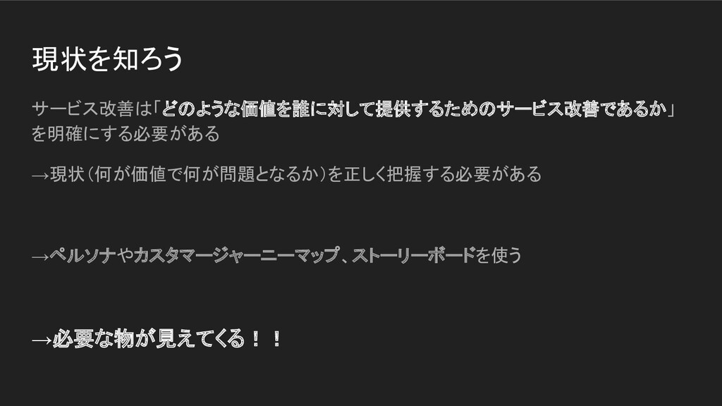 現状を知ろう サービス改善は「どのような価値を誰に対して提供するためのサービス改善であるか」 を明確にする必要がある →現状(何が価値で何が問題となるか)を正しく把握する必要がある →ペルソナやカスタマージャーニーマップ、ストーリーボードを使う →必要な物が見えてくる!!