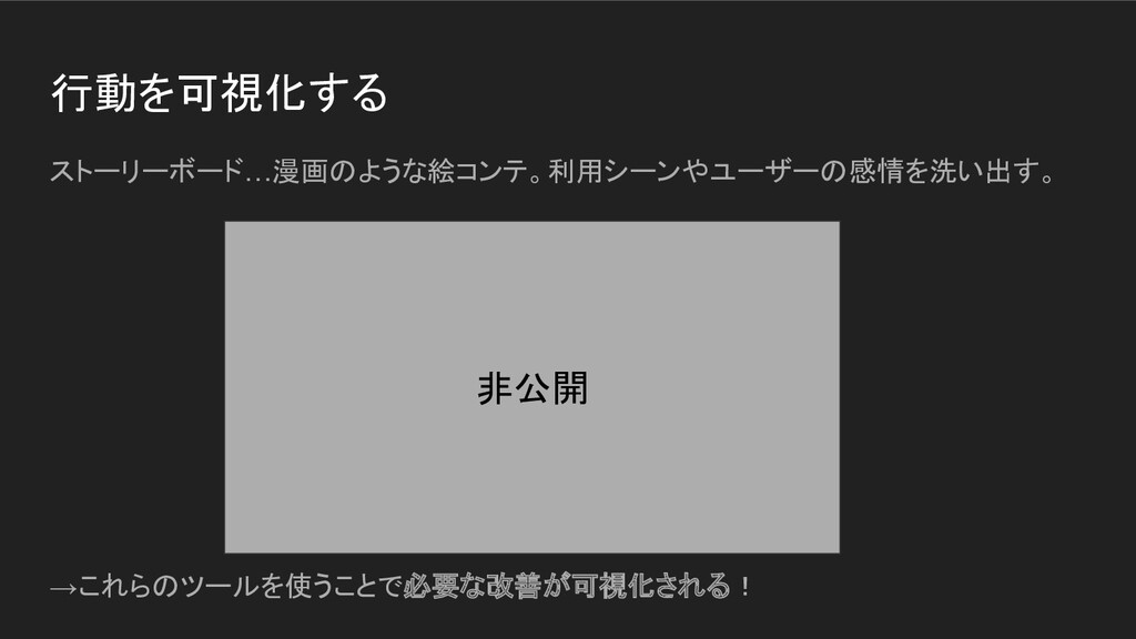行動を可視化する ストーリーボード…漫画のような絵コンテ。利用シーンやユーザーの感情を洗い出す。 →これらのツールを使うことで必要な改善が可視化される! 非公開