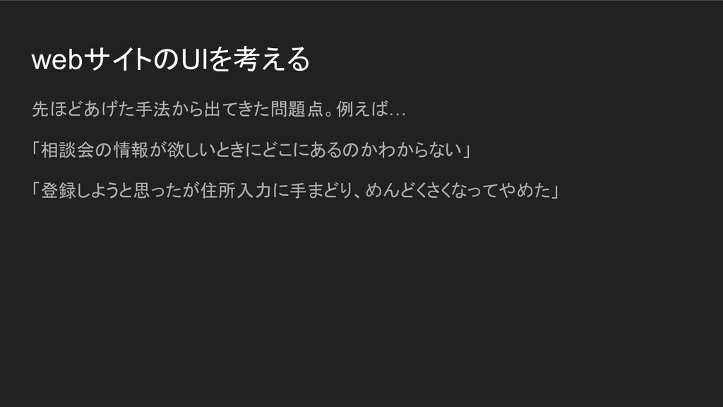 webサイトのUIを考える 先ほどあげた手法から出てきた問題点。例えば… 「相談会の情報が欲しいときにどこにあるのかわからない」 「登録しようと思ったが住所入力に手まどり、めんどくさくなってやめた」