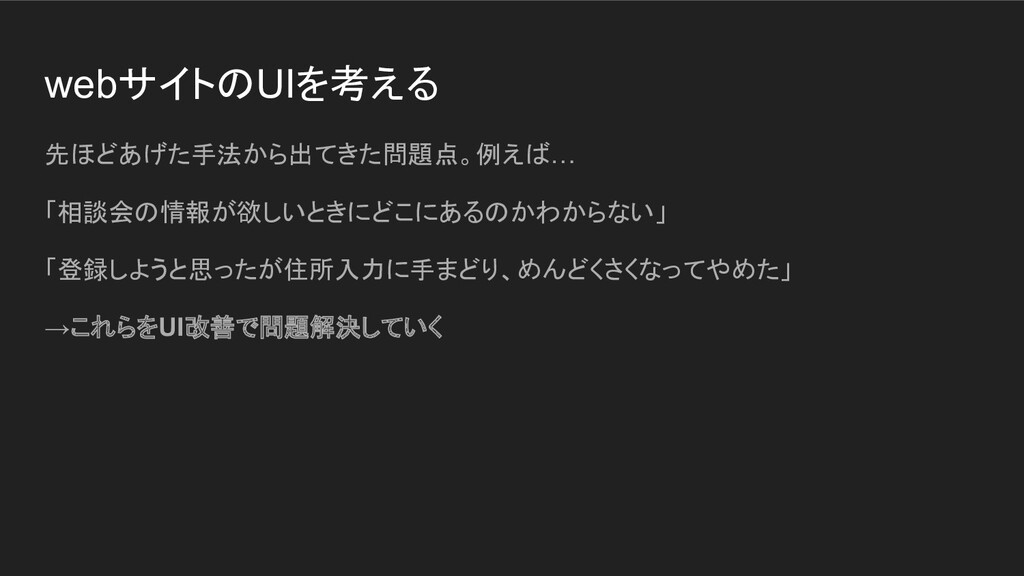 webサイトのUIを考える 先ほどあげた手法から出てきた問題点。例えば… 「相談会の情報が欲しいときにどこにあるのかわからない」 「登録しようと思ったが住所入力に手まどり、めんどくさくなってやめた」 →これらをUI改善で問題解決していく