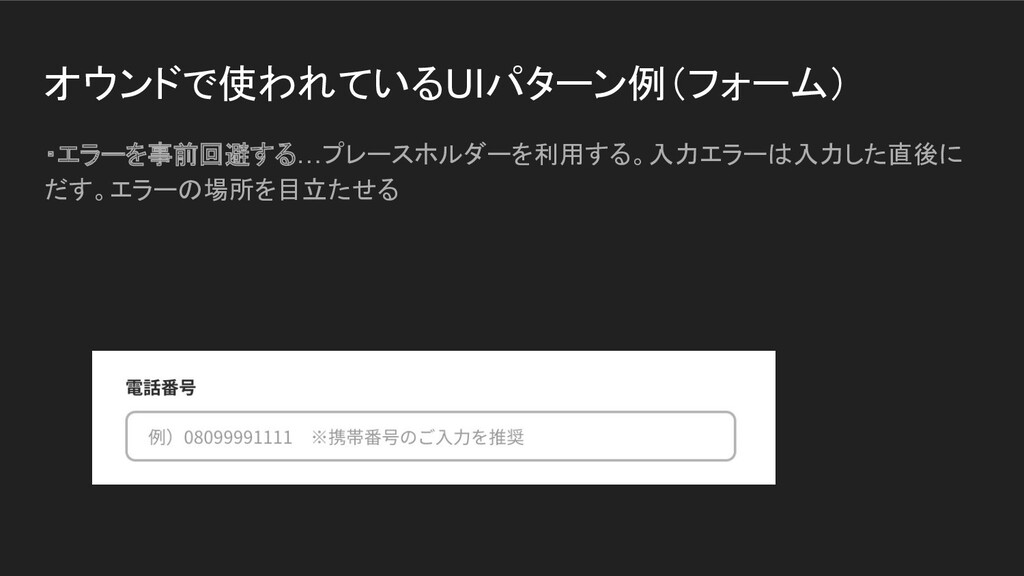 オウンドで使われているUIパターン例(フォーム) ・エラーを事前回避する…プレースホルダーを利用する。入力エラーは入力した直後に だす。エラーの場所を目立たせる