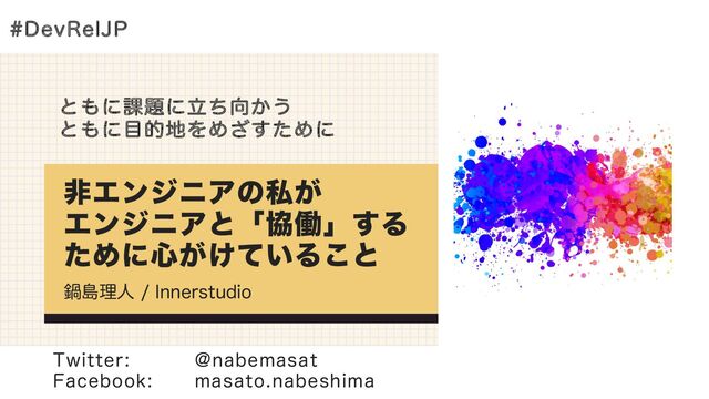 ඇΤϯδχΞͷࢲ͕ ΤϯδχΞͱʮڠಇʯ͢Δ ͨΊʹ৺͕͚͍ͯΔ͜ͱ 5XJUUFS !OBCFNBTBU 'BDFCPPL NBTBUPOBCFTIJNB ͱʹ՝ʹཱ͔ͪ͏ ͱʹతΛΊͨ͟͢Ίʹ ುౡཧਓ
