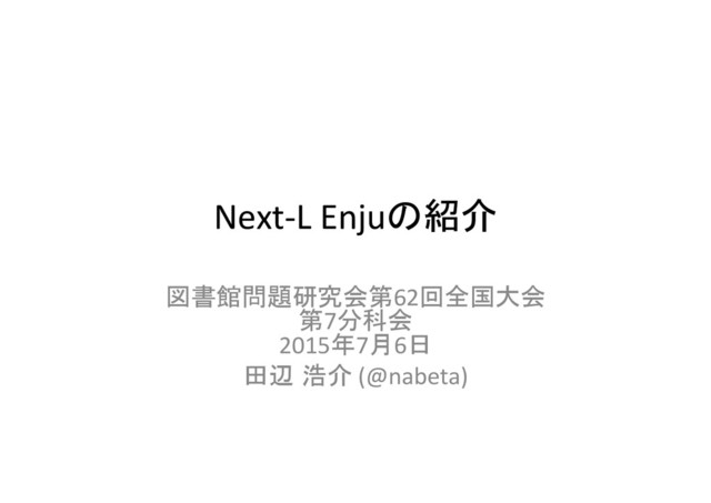 Next-‐L Enjuの紹介 図書館問題研究会第62回全国大会 第7分科会 2015年7月6日 田辺 浩介