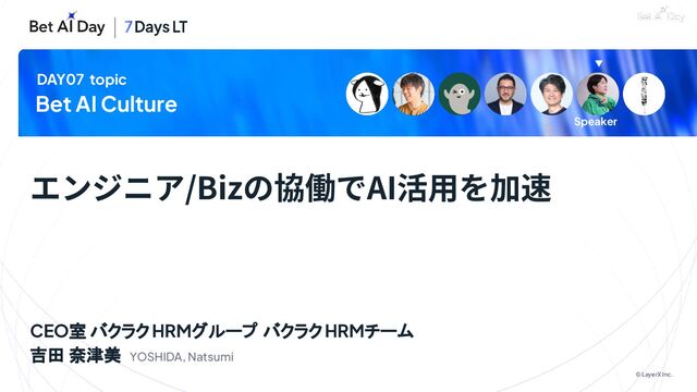© LayerX Inc. エンジニア/Bizの協働でAI活⽤を加速 CEO室 バクラクHRMグループ バクラクHRMチーム 吉田 奈津美 YOSHIDA,