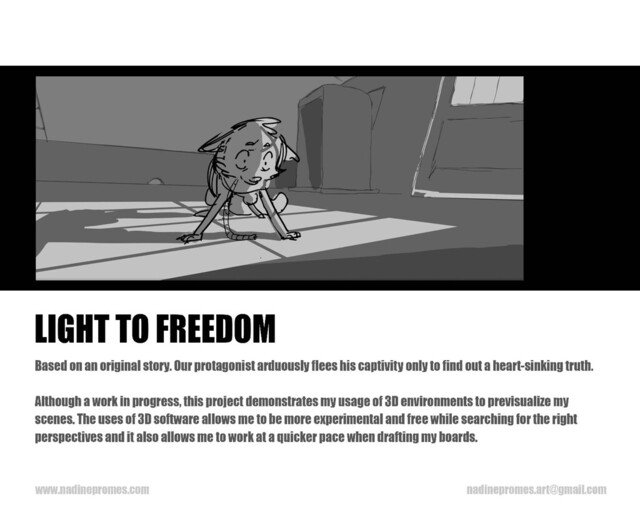 Although a work in progress, this project demonstrates mv usage of 3D environments to previsualize mv scenes. The uses of 3D software allows me to be more experimental and free while searching for the right perspectives and it also allows me to work at a quicker pace when drafting my boards.