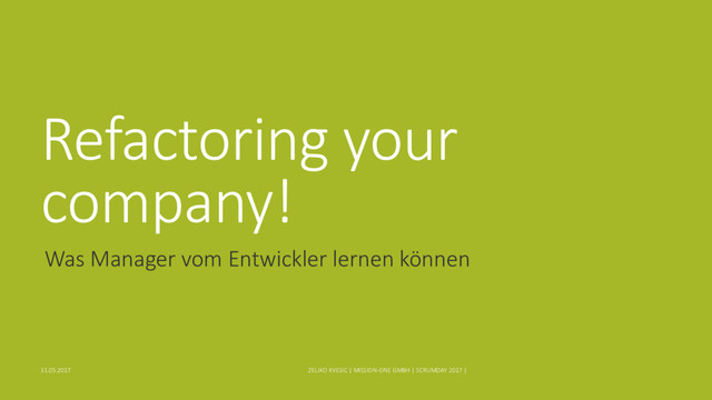 Die Definition von Refactoring aus Wikipedia sagt folgendes: "Refactoring (auch Refaktorisierung, Refaktorierung oder Restrukturierung) bezeichnet in der Software-Entwicklung die manuelle oder automatisierte Strukturverbesserung von Quelltexten unter Beibehaltung des beobachtbaren Programmverhaltens." Es handelt sich hierbei im Prinzip also um eine Verbesserung wobei die Funktion bzw. das gewünschte Verhalten beibehalten werden. Deshalb habe ich mir folgende Fragen gestellt: "Warum handeln Manager und Unternehmer nicht ähnlich? Warum verändern sich Unternehmen kaum bzw. viel zu langsam oder viel zu selten? Was kann ein Manager daraus lernen und wie kann man Unternehmen Refaktorisieren um sie agil und lean zu gestalten? Im diesem Vortrag werde ich den Versuch wagen, Manager zum Umdenken zu bewegen, Anregungen zu liefern und ein paar Antworten zu finden.