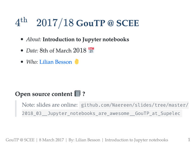 format, .ipynb (just JSON with constraints) 2. An editor in your browser (see it during demo time) 3. Tools to convert .ipynb files to scripts, HTML, slides, PDF etc. Practical aspect 4. A very good way to interact with your code 5. Create smart document with text, maths, code, output and figures, all included in one file 6. Easy and perfect to share online and with colleagues ! GouTP @ SCEE | 8 March 217 | By: Lilian Besson | Introduction to Jupyter notebooks 12