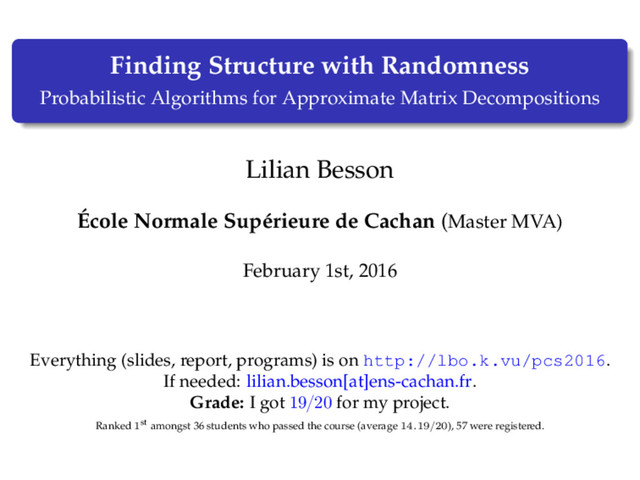 Probabilistic Algorithms for Approximate Matrix Decompositions.