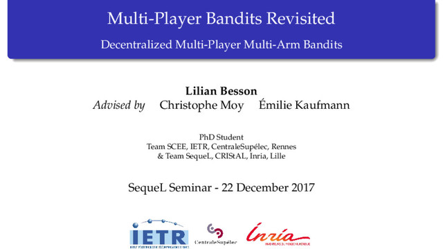 Abstract : Multi-player Multi-Armed Bandits (MAB) have been extensively studied in the literature, motivated by applications to Cognitive Radio systems. Driven by such applications as well, we motivate the introduction of several levels of feedback for multi-player MAB algorithms. Most existing work assume that sensing information is available to the algorithm. Under this assumption, we improve the state-of-the-art lower bound for the regret of any decentralized algorithms and introduce two algorithms, RandTopM and MCTopM, that are shown to empirically outperform existing algorithms. Moreover, we provide strong theoretical guarantees for these algorithms, including a notion of asymptotic optimality in terms of the number of selections of bad arms. We then introduce a promising heuristic, called Selfish, that can operate without sensing information, which is crucial for emerging applications to Internet of Things networks. We investigate the empirical performance of this algorithm and provide some first theoretical elements for the understanding of its behavior.