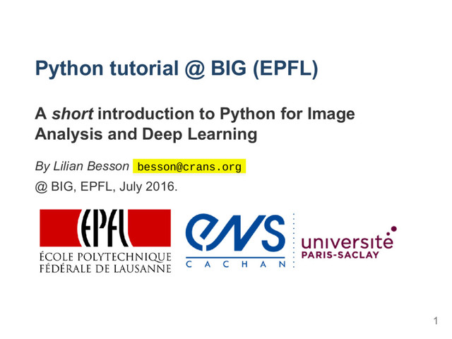 laptop , during the tutorial 1. Download Anaconda (Python 3.5) from continuum.io/downloads (~ 346 Mo) 2. Install it: doubleclick the downloaded . p k g file (on Mac) or . e x e file (on Windows),, and follow the instructions 3. Check that Python ( p y t h o n 3 ) has been installed: $ p y t h o n 3 [ i t s h o u l d w o r k ] 3