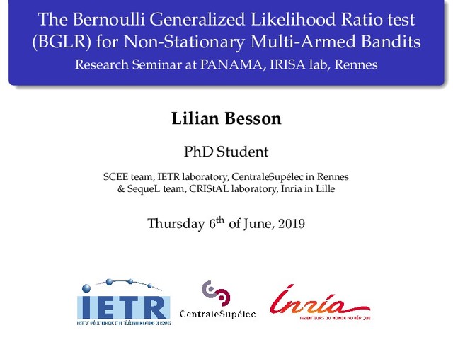 Abstract : We propose a new algorithm for the piece-wise i.i.d. non-stationary bandit problem with bounded rewards. Our proposal, GLR-klUCB, combines an efficient bandit algorithm, klUCB, with an efficient, parameter-free, change-point detector, the Bernoulli Generalized Likelihood Ratio Test, for which we provide new theoretical guarantees of independent interest. We analyze two variants of our strategy, based on local restarts and global restarts, and show that their regret is upper-bounded by O(Υ_T √(T log(T))) if the number of change-points Υ_T is unknown, and by O(√(Υ_T T log(T))) if Υ_T is known. This matches the current state-of-the-art bounds, as our algorithm needs no tuning based on knowledge of the problem complexity other than Υ_T. We present numerical experiments showing that GLR-klUCB outperforms passively and actively adaptive algorithms from the literature, and highlight the benefit of using local restarts.