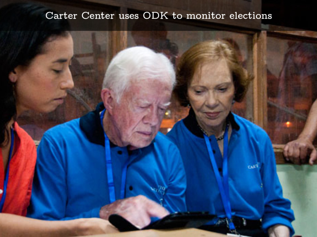 * The Carter Center uses ODK to get the real-time data needed to assess elections. Over the last six years, ODK has been used to monitor elections in Liberia, Egypt, Libya, Kenya, Nepal, the Democratic Republic of Congo, Mozambique, and Tunisia. Video: https://goo.gl/FVg4Ru