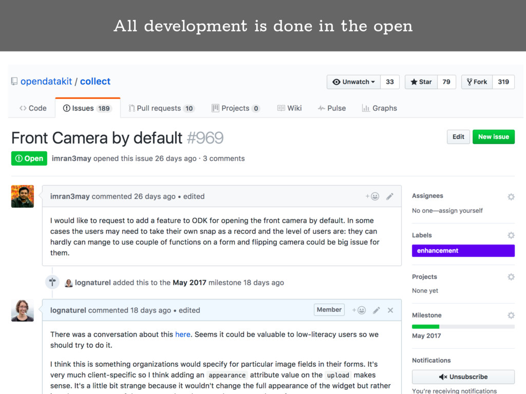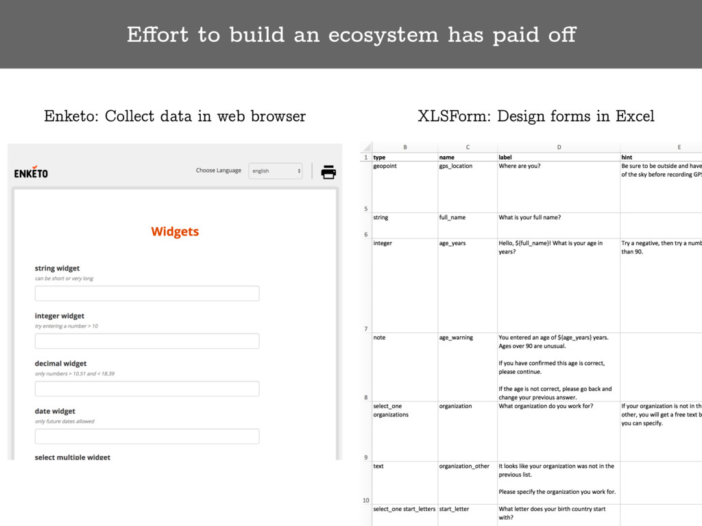 ODK was designed for novice users in challenging environments (e.g., offline villages in Kenya or under heavy canopy in the Amazon) and its robustness in these environments has driven the platform’s adoption and evolution. Additionally, the choice to build an open source community around ODK has allowed it to benefit from volunteer and paid contributions from users, implementers, and developers.