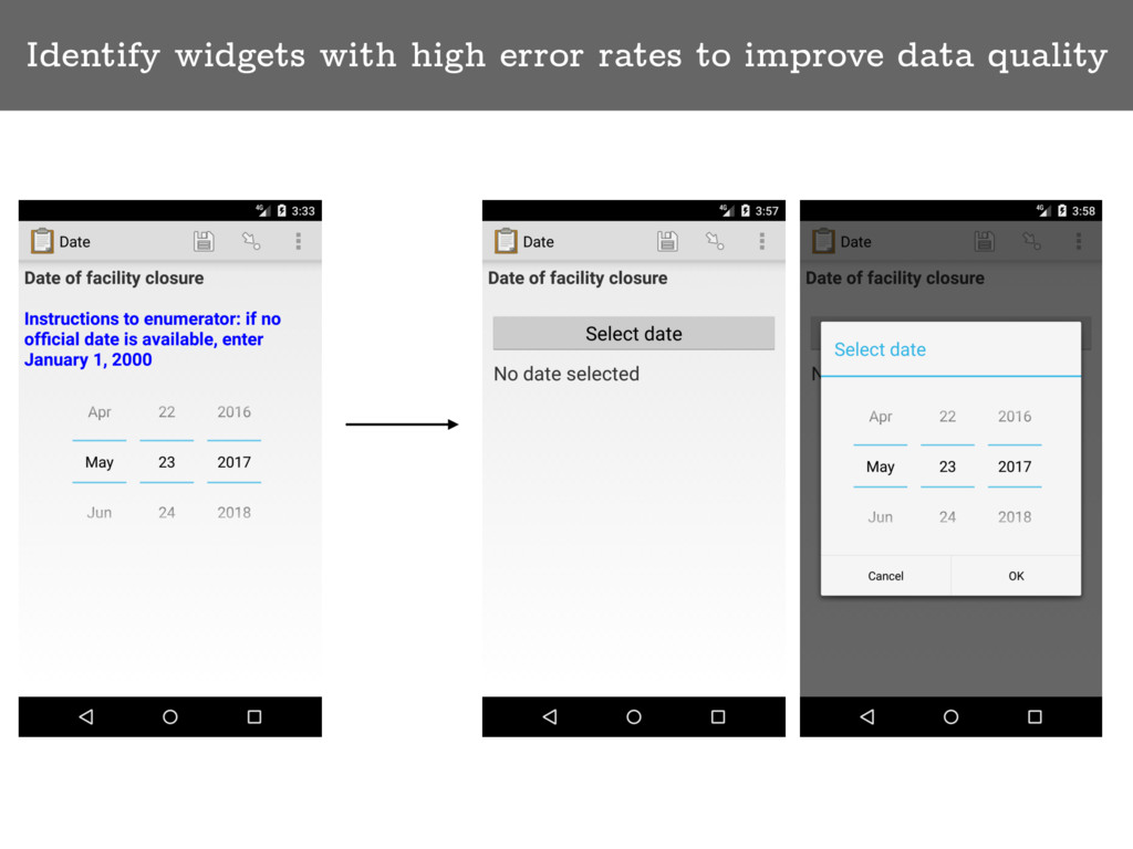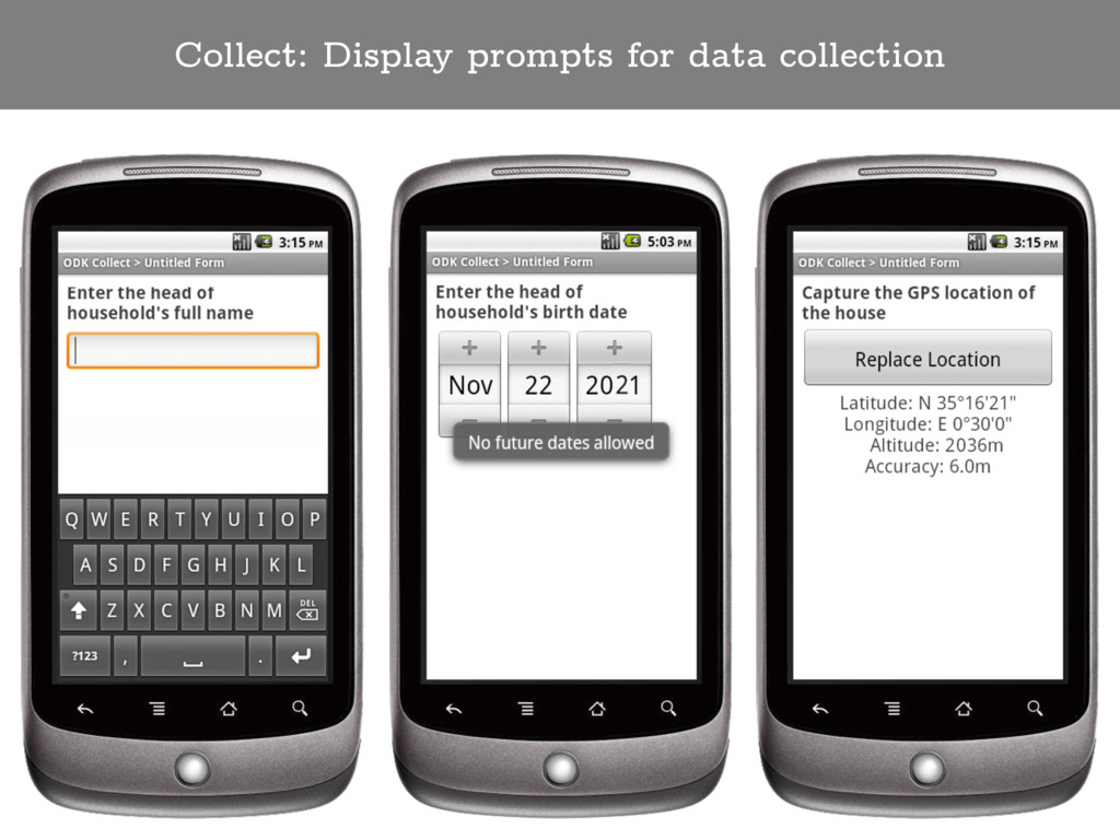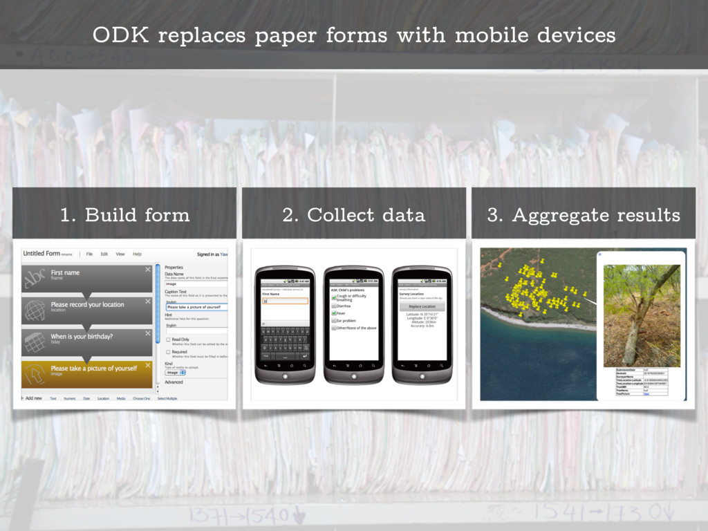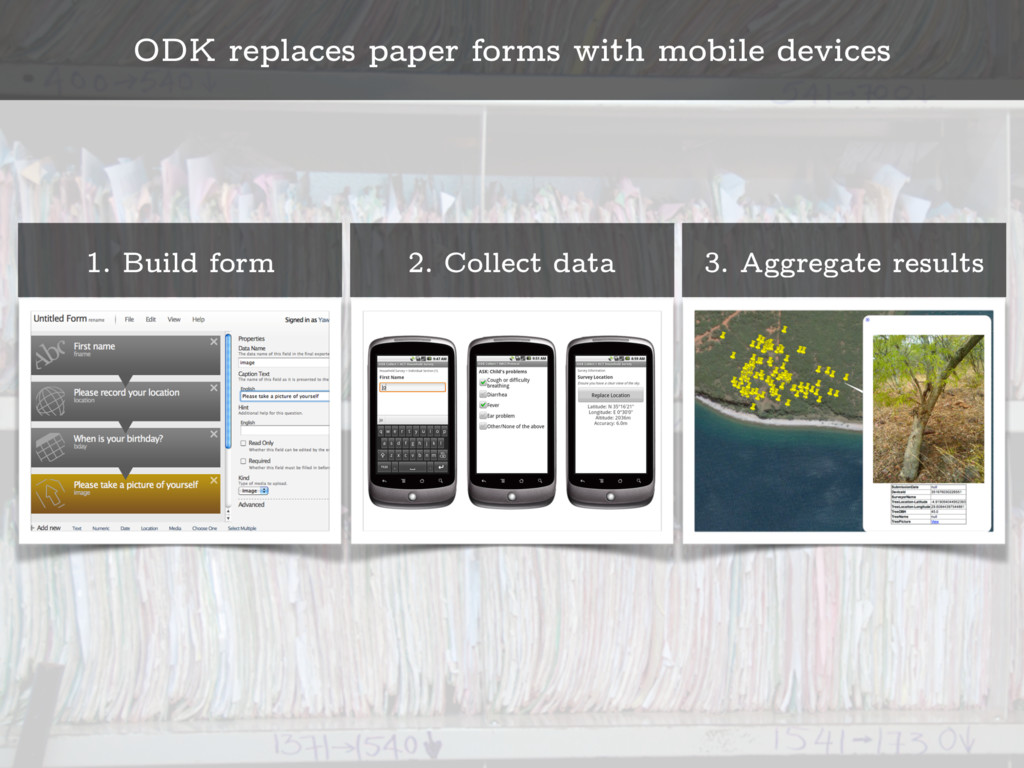 Open Data Kit (ODK) replaces paper surveys with smartphones. ODK tools are open-source and are primarily used by social good organizations to collect data quickly, accurately, offline, and at scale. ODK has been used to collect billions of data points around the world. Projects include: