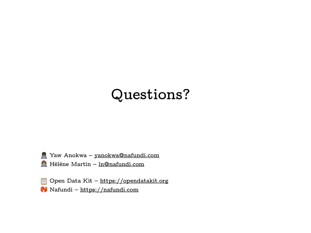 Nafundi creates technologies that improve the lives of the underserved. Our current focus is designing, building, deploying, and supporting mobile data collection systems that work well in challenging environments. Yaw Anokwa, Nafundi’s CEO, co-founded and co-leads the ODK project with the University of Washington. Hélène Martin, Nafundi’s CTO, leads much of the technical work on the popular ODK 1.0 tools. Find out more at https://nafundi.com.