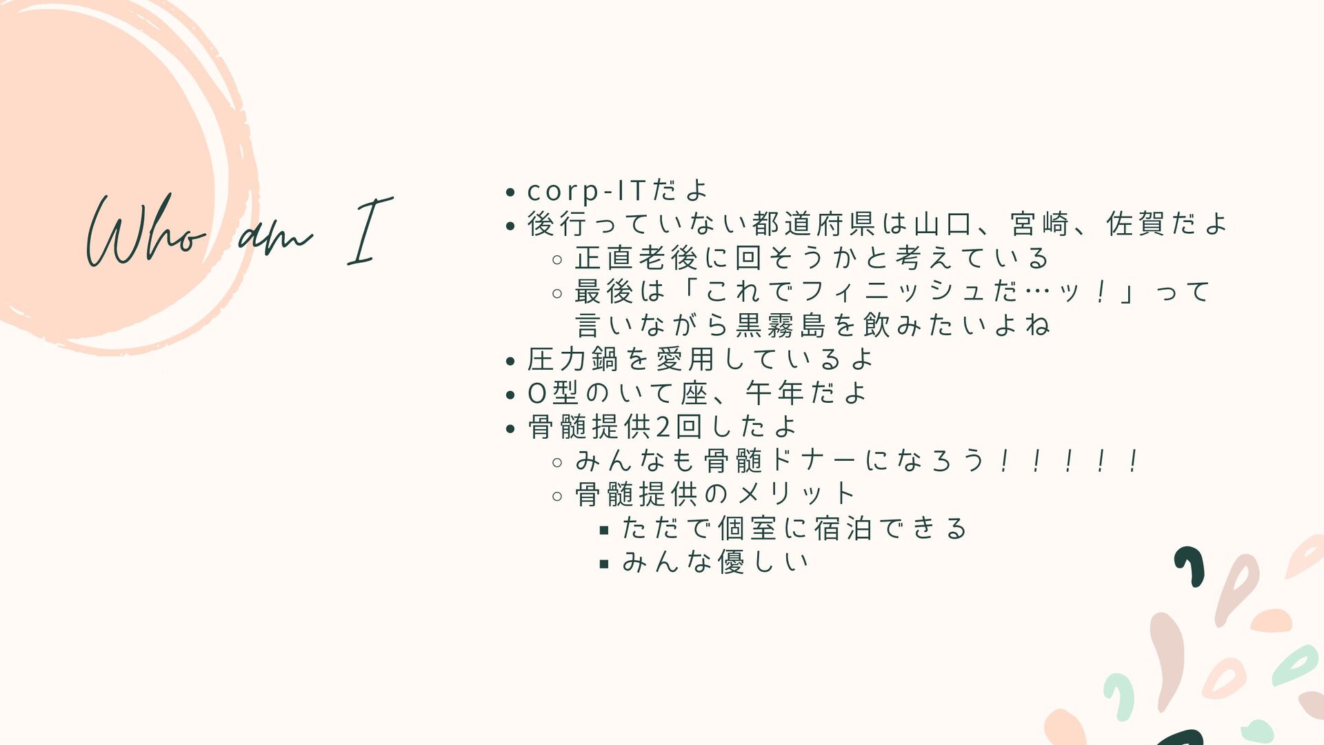 行 っ て い な い 都 道 府 県 は 山 口 、 宮 崎 、 佐 賀 だ よ 正 直 老 後 に 回 そ う か と 考 え て い る 最 後 は 「 こ れ で フ ィ ニ ッ シ ュ だ … ッ ! 」 っ て 言 い な が ら 黒 霧 島 を 飲 み た い よ ね 圧 力 鍋 を 愛 用 し て い る よ O 型 の い て 座 、 午 年 だ よ 骨 髄 提 供 2 回 し た よ み ん な も 骨 髄 ド ナ ー に な ろ う ! ! ! ! ! 骨 髄 提 供 の メ リ ッ ト た だ で 個 室 に 宿 泊 で き る み ん な 優 し い Who am I
