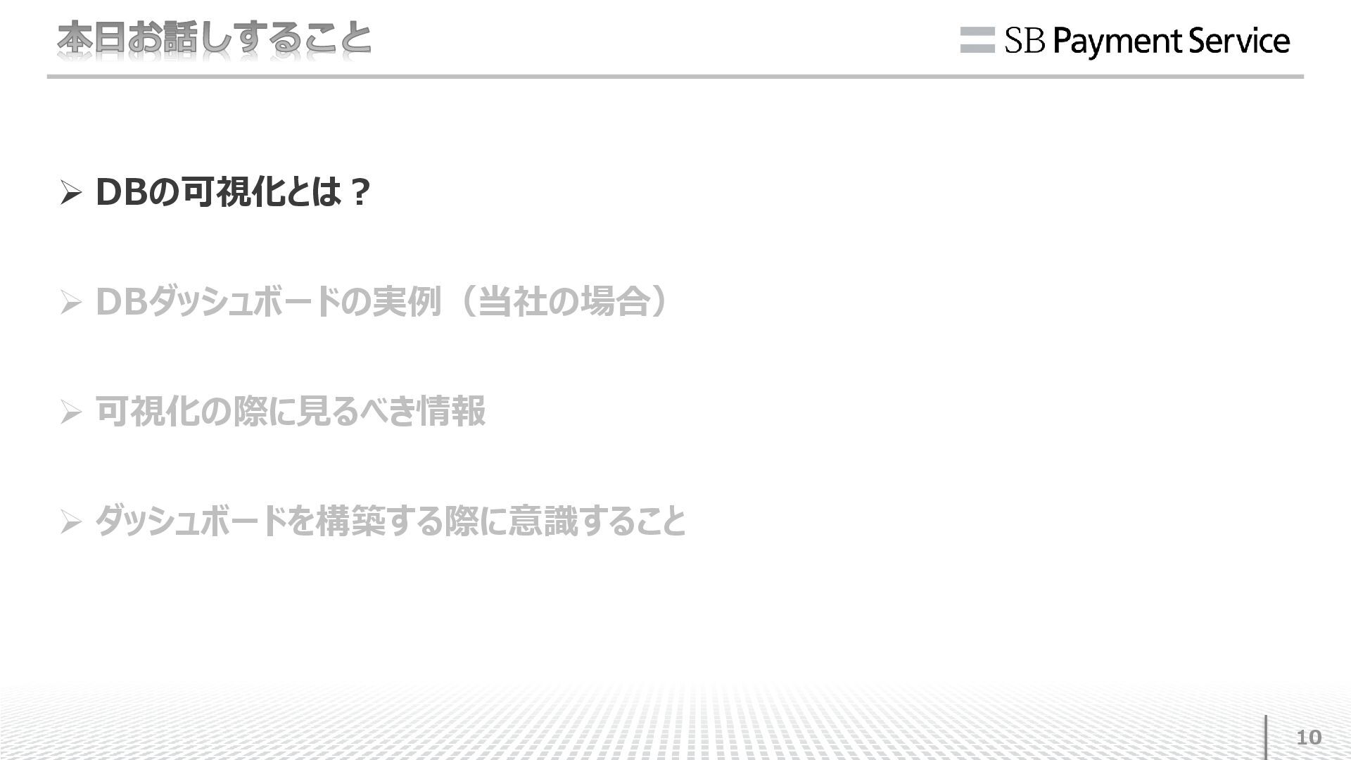 本日お話しすること 9 ➢ DBの可視化とは? ➢ DBダッシュボードの実例(当社の場合) ➢ 可視化の際に見るべき情報 ➢ ダッシュボードを構築する際に意識すること