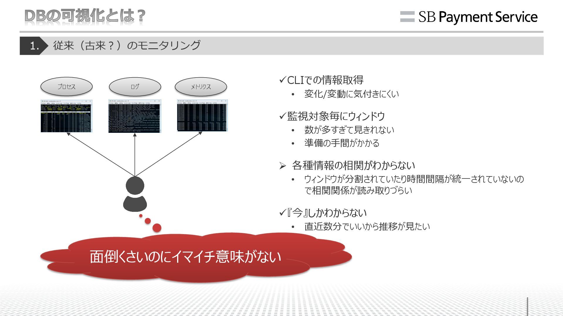 DBの可視化とは? 1. 従来(古来?)のモニタリング プロセス ログ メトリクス ✓CLIでの情報取得 • 変化/変動に気付きにくい ✓監視対象毎にウィンドウ
