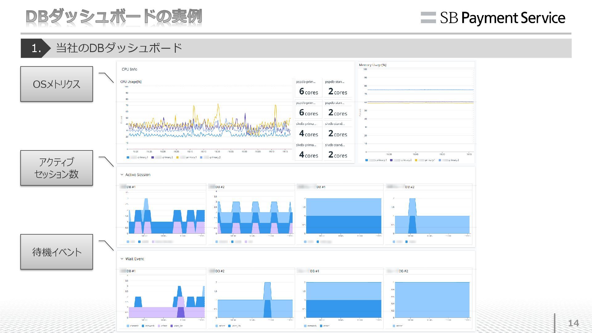本日お話しすること 13 ➢ DBの可視化とは? ➢ DBダッシュボードの実例(当社の場合) ➢ 可視化の際に見るべき情報 ➢ ダッシュボードを構築する際に意識すること
