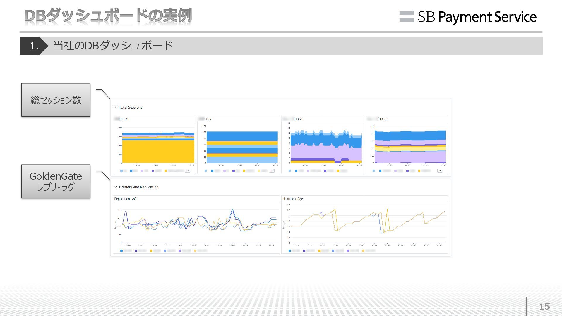 DBダッシュボードの実例 15 1. 当社のDBダッシュボード 総セッション数 GoldenGate レプリ・ラグ