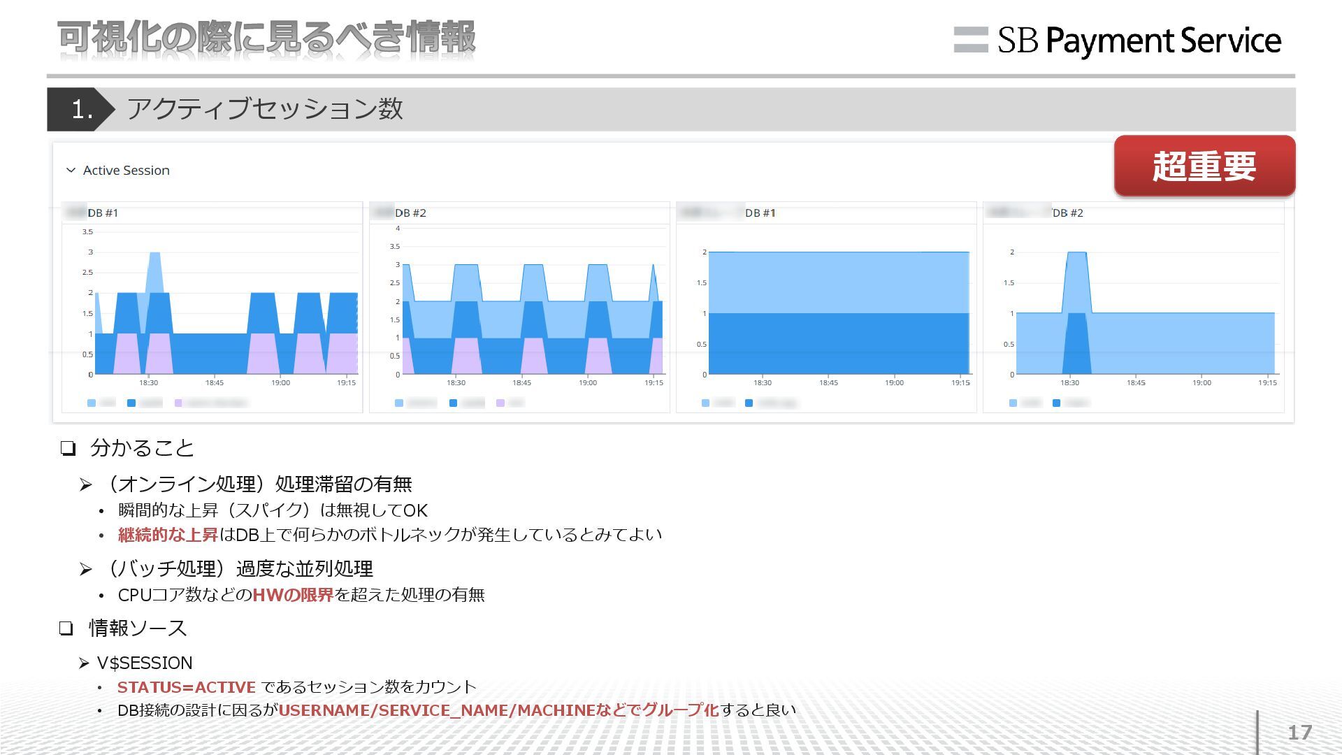 可視化の際に見るべき情報 17 1. アクティブセッション数 ❏ 分かること ➢ (オンライン処理)処理滞留の有無 • 瞬間的な上昇(スパイク)は無視してOK
