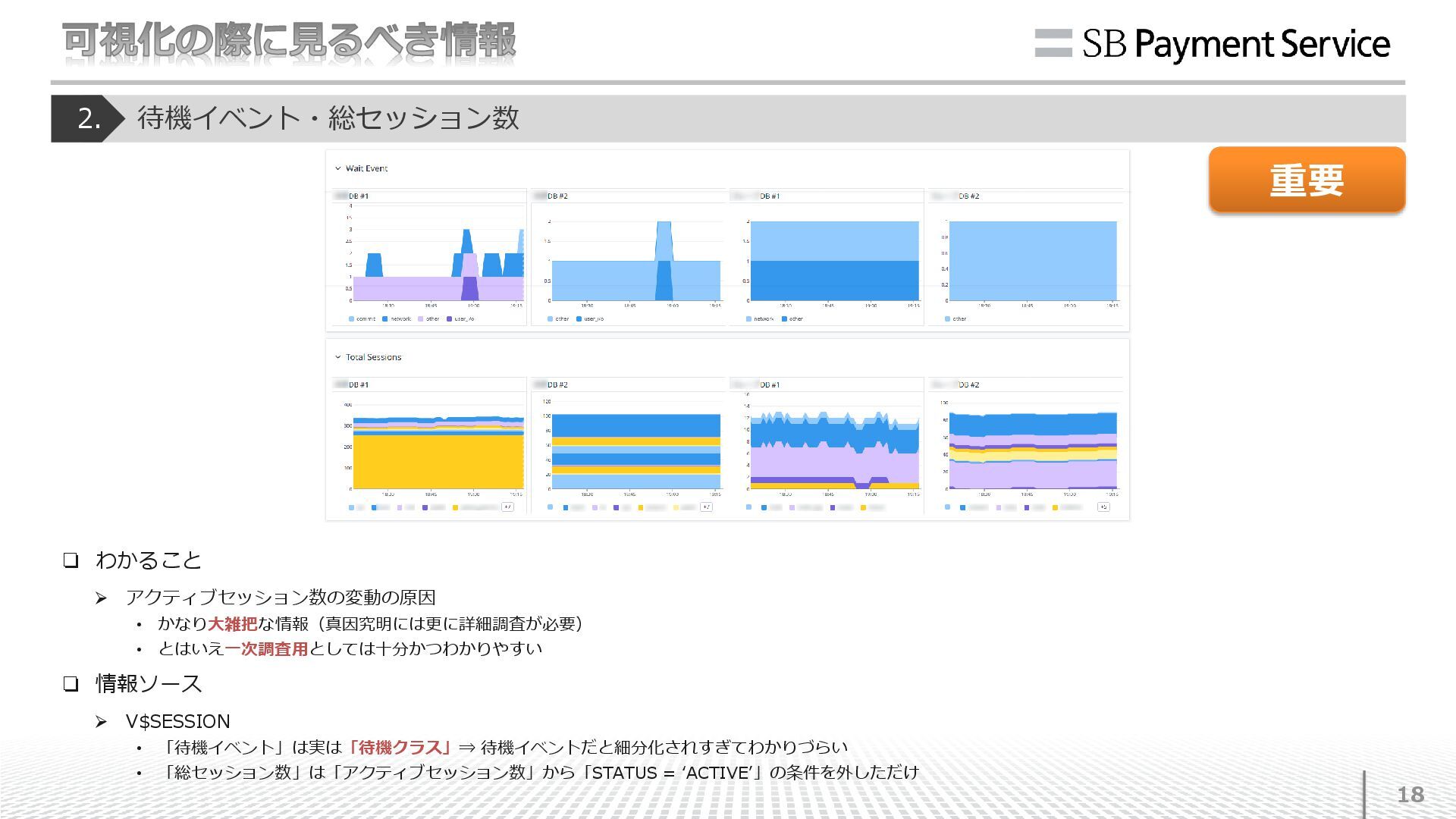 「総セッション数」は「アクティブセッション数」から「STATUS = ‘ACTIVE’」の条件を外しただけ 2. 待機イベント・総セッション数 重要 ❏ わかること ➢ アクティブセッション数の変動の原因 • かなり大雑把な情報(真因究明には更に詳細調査が必要) • とはいえ一次調査用としては十分かつわかりやすい